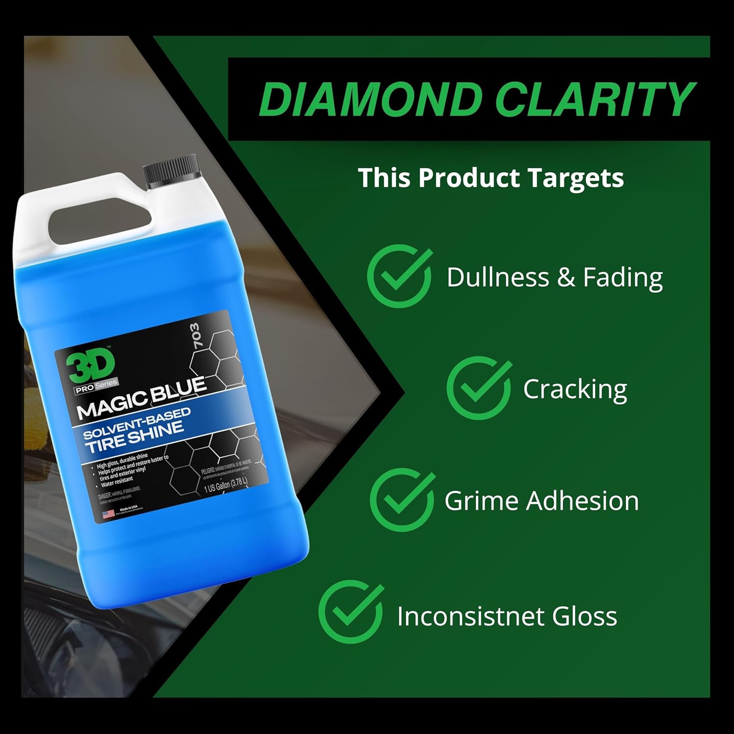 - Water Repellant Rain Ready Protection: 3D Magic Blue is a solvent-based tire shine that repels water and road spray. Perfect for wet conditions, this high-gloss formula clings to rubber and plastic, giving your tires a deep, black shine that stays put, rain or shine