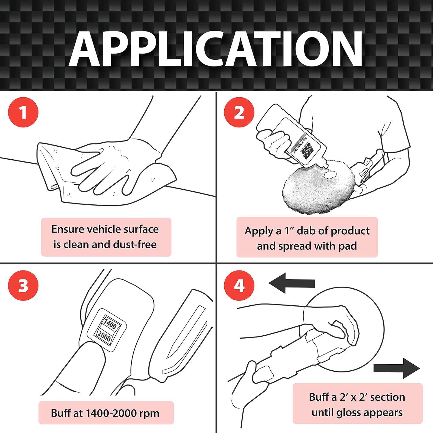 - HOW TO USE: Rejuvenator is professional grade wax product that requires advanced application skills. Rejuvenator should be applied using an orbital polisher. Apply a 1” dab of Rejuvenator for a 2’ x 2’ section and spread with the pad. Buff at a speed between 1400 – 2000 rpm. Work the buffer slowly from side to side and front to back until most of the product is gone and gloss appears.