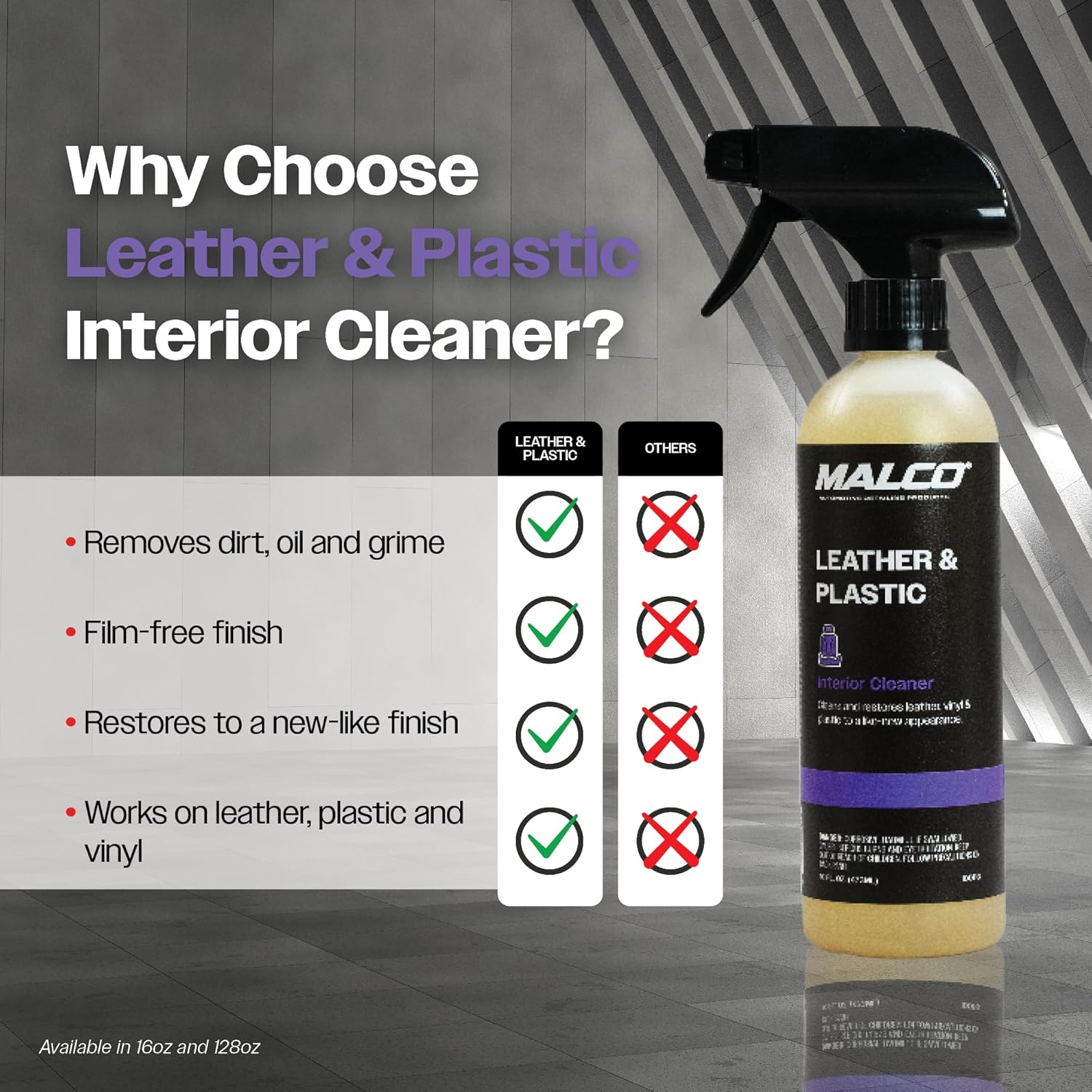 Malco Leather & Plastic Cleaner – Penetrates Deep to Remove Dirt, Grime and Oily Soils/Restores Leather, Plastic and Vinyl/Leaves Surfaces Clean, Shiny and Film-Free / 16 Oz. (100116)