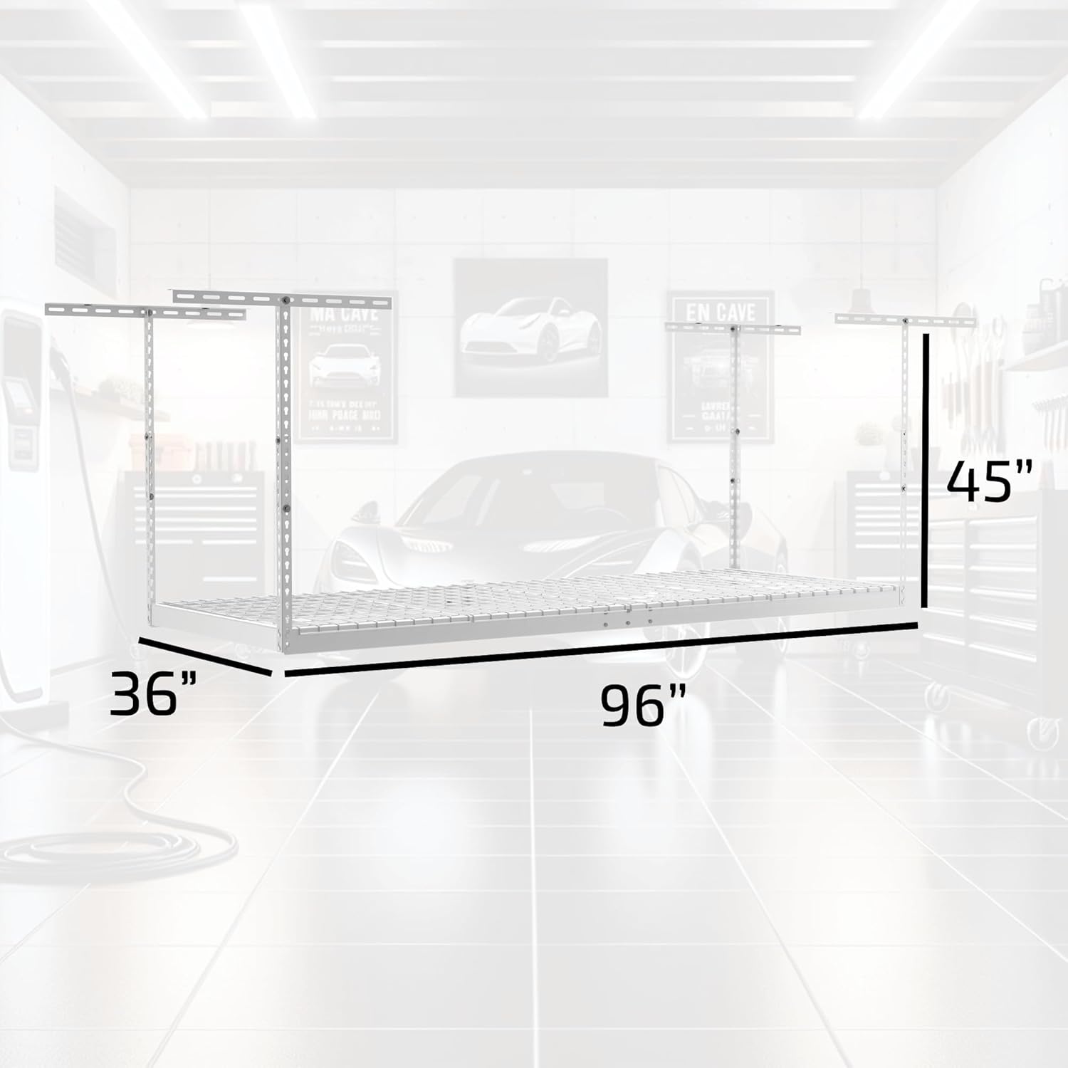 - ADJUSTABLE CEILING HEIGHT: Convert your garage from functionless to functional space. Our ceiling organizer has an adjustable drop-down range letting you customize the distance between the shelf and ceiling from 24" to 45". This 3 foot by 8 foot ceiling-mounted rack adds up to 60 cubic feet of storage.
