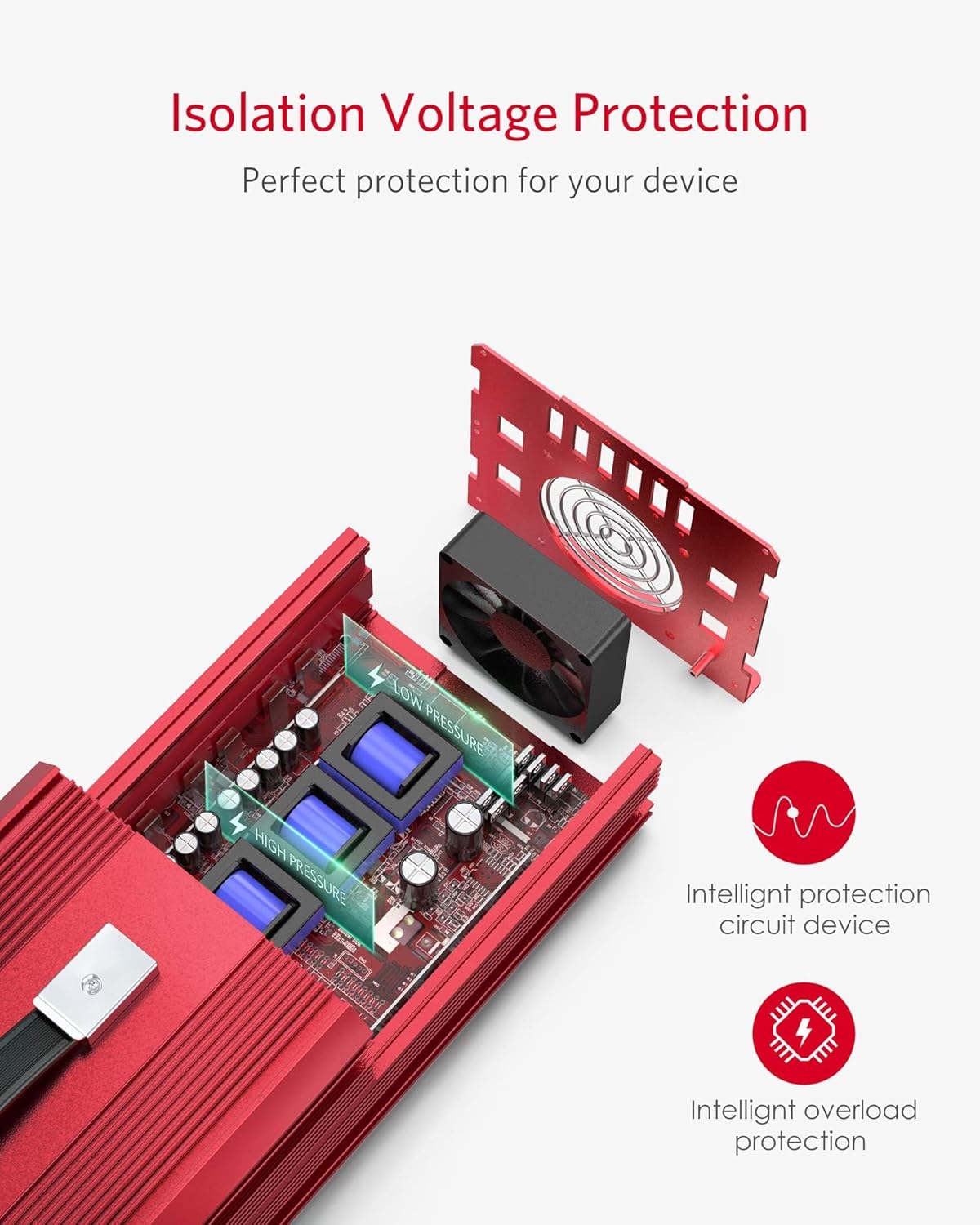 - Convert DC 12V to AC 110V: It provides total 2000W output with 3 110V AC outlets,can supply power to AC household appliances or large electrical devices on trips,camping or work sites,such as flood light,TV,freezer,Laptop,DVD player,PSP,Camera or recharging mobile phone/iPad etc.