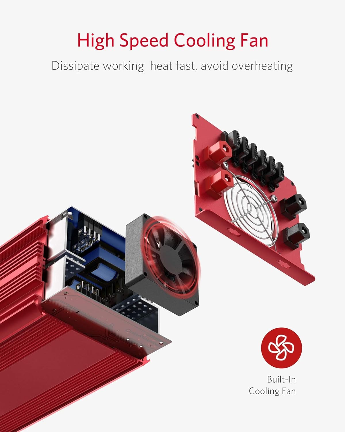 - Multi-Protection: Built-in 6 external 50A fuse to protect your devices from damage,including an audible overload/over/under voltage/short circuit alarm via LED light special high & low voltage isolated protection.Red light is under protection (shut down) and green light is working normally.
