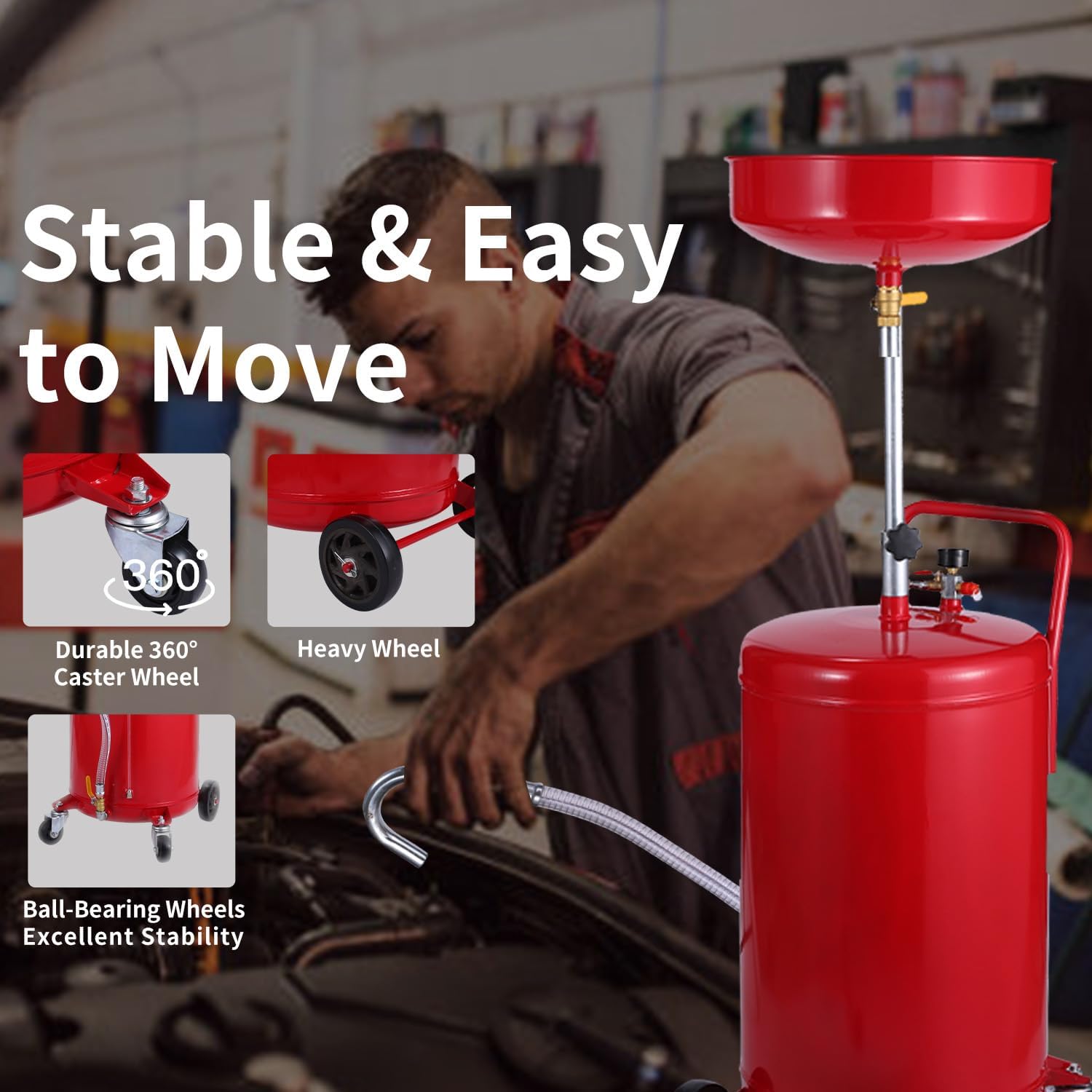 XtremepowerUS 20 Gallon Portable Waste Oil Drain Tank Air Operated Drainage Adjustable Funnel Height with Wheel, Red