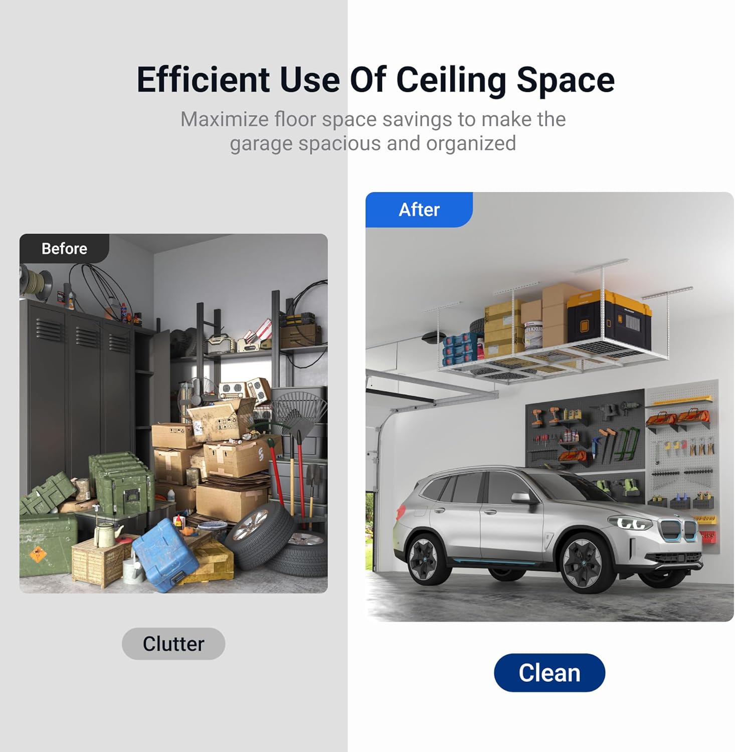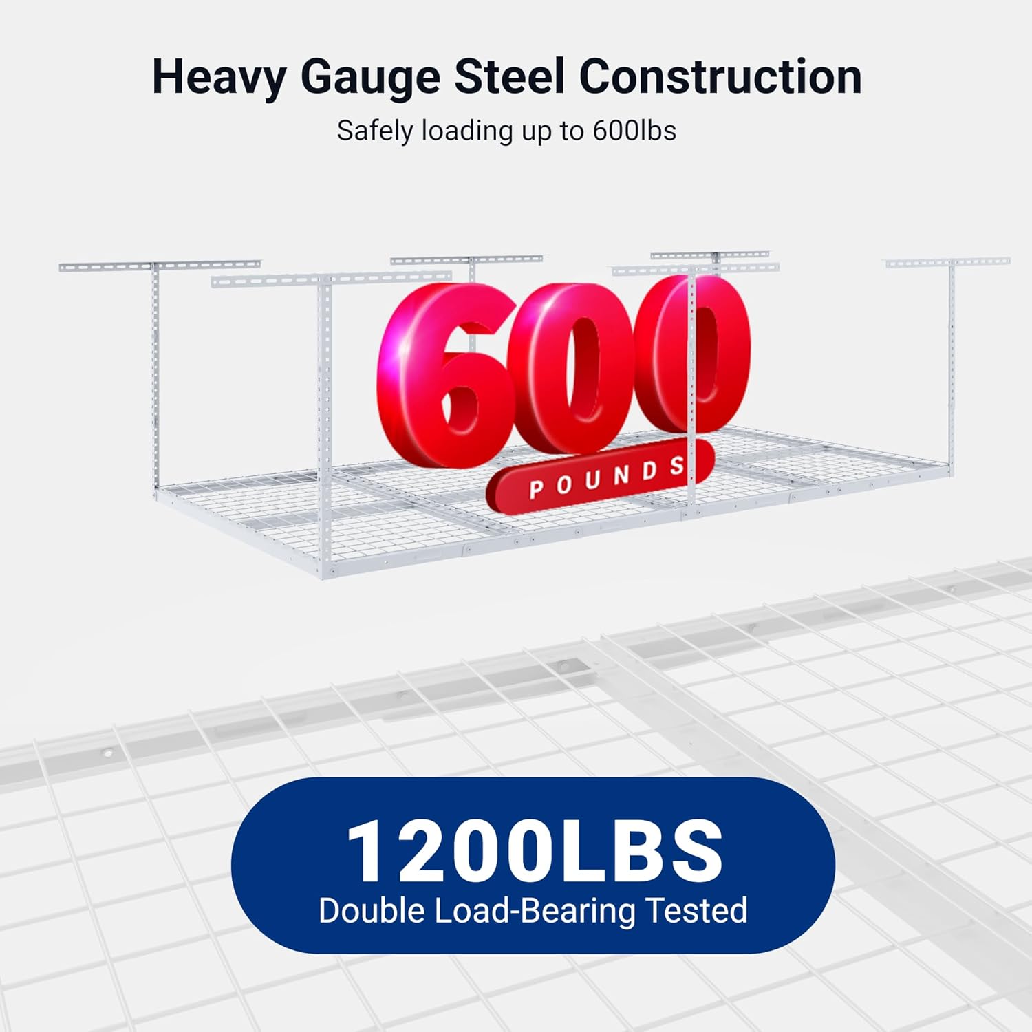 - 1200 lbs Tested, 600 lbs Rated: Our overhead garage storage rack undergoes rigorous double load testing (1200 lbs) to ensure unmatched safety and durability, supporting up to 600 lbs for your tools and equipment.