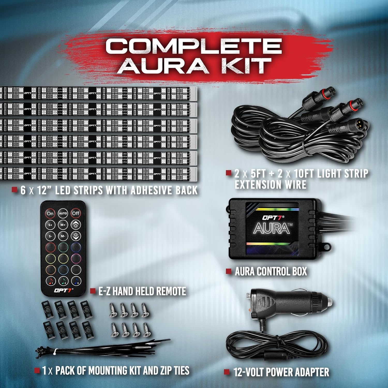 - [Set the Ambience] Gather the attention of others with the OPT7 Aura Interior LED light strips! These LED strips are the best for your vehicle, featuring plenty of brightness and a wireless remote (Cycle, Strobe, Color Fade, Dimmers).