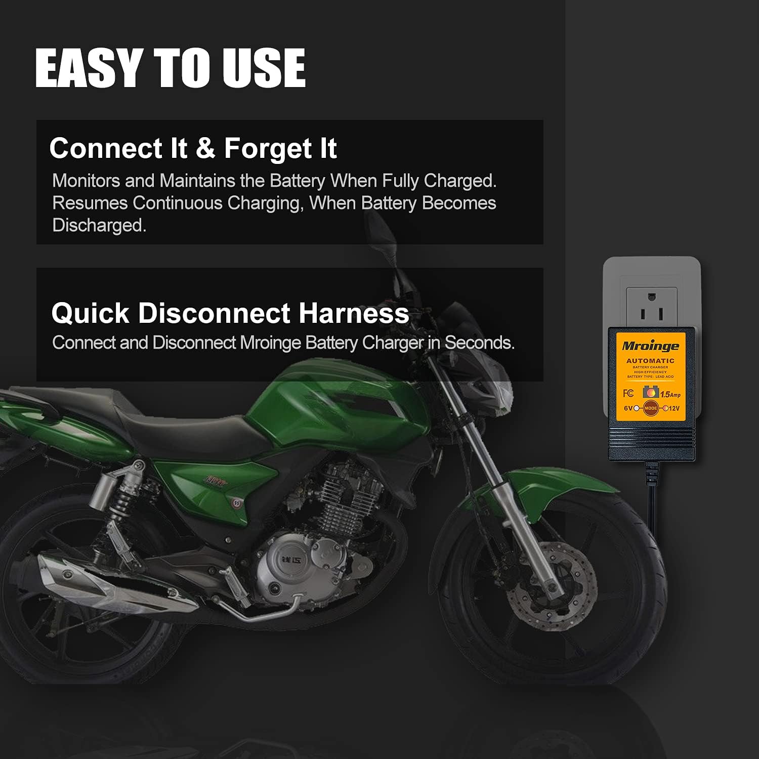 MBC015, 6V / 12V 1.5A Fully Automatic Trickle Battery Charger/Maintainer for Automotive Vehicle Motorcycle Lawn Mower ATV RV Powersport Boat, Sealed Deep-Cycle AGM Gel Cell Lead Acid Batteries