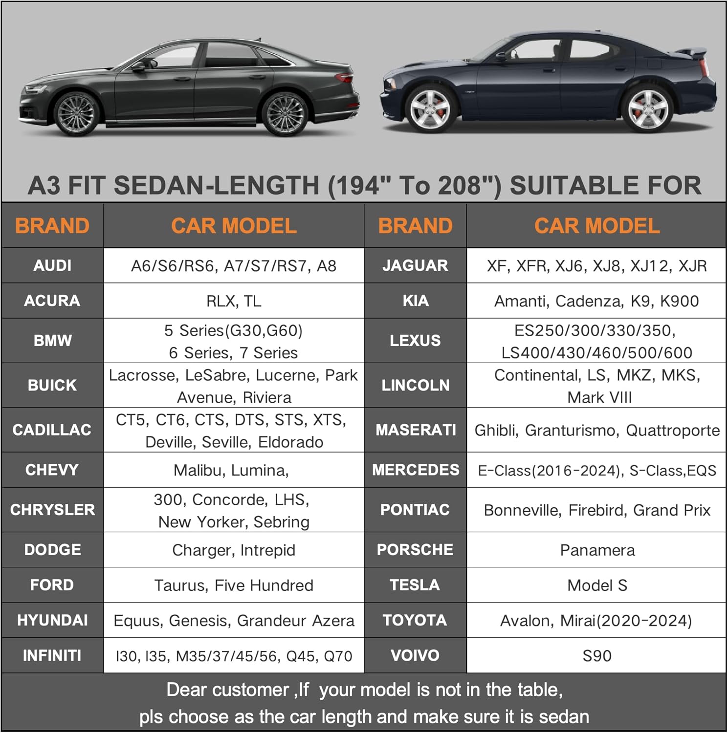 - 【Dimension A3】— Universal fit for sedan which length is 194 to 208 inch (NOT FOR SUV AND HATCHBACK). Suitable for Dodge Charger/Challenger, Lincoln Mkz/Mks/Continental, Jaguar XJ/XF, Toyota avalon/Mirai, Chrysler 300, Audi A7/A8, Tesla Model s, Hyundai Genesis, BMW 7 series, Mercedes-Benz S-Class, Cadillac CT5/CT6/CTS/DTS/STS/XTS/Seville/Deville/Eldorado etc.