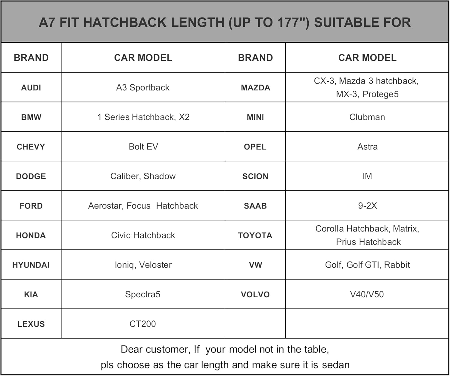 - 【Dimension A7】— Universal fit for hatchback which length is up to 177 inch (NOT FOR SEDAN AND SUV). Suitable for VW Golf/Gti/Rabbit, Mini Clubman, Toyota Matrix, Honda Fit, BMW 1 Series/X2, Lexus CT200, Hyundai Veloster, Ford Focus hatchback, Chevy Bolt, Audi A3 hatchback etc.