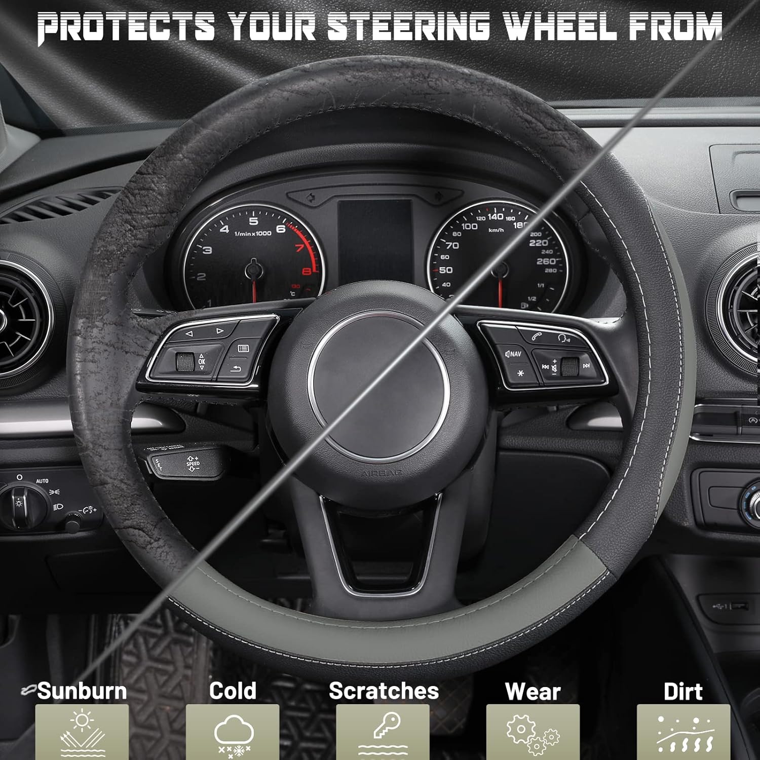 - NO MORE STICKY: The auto steering wheel cover is comfy to hold, it absorbs the hand-sweat that the summer heat causes, and allows you to grip the steering wheel much better.