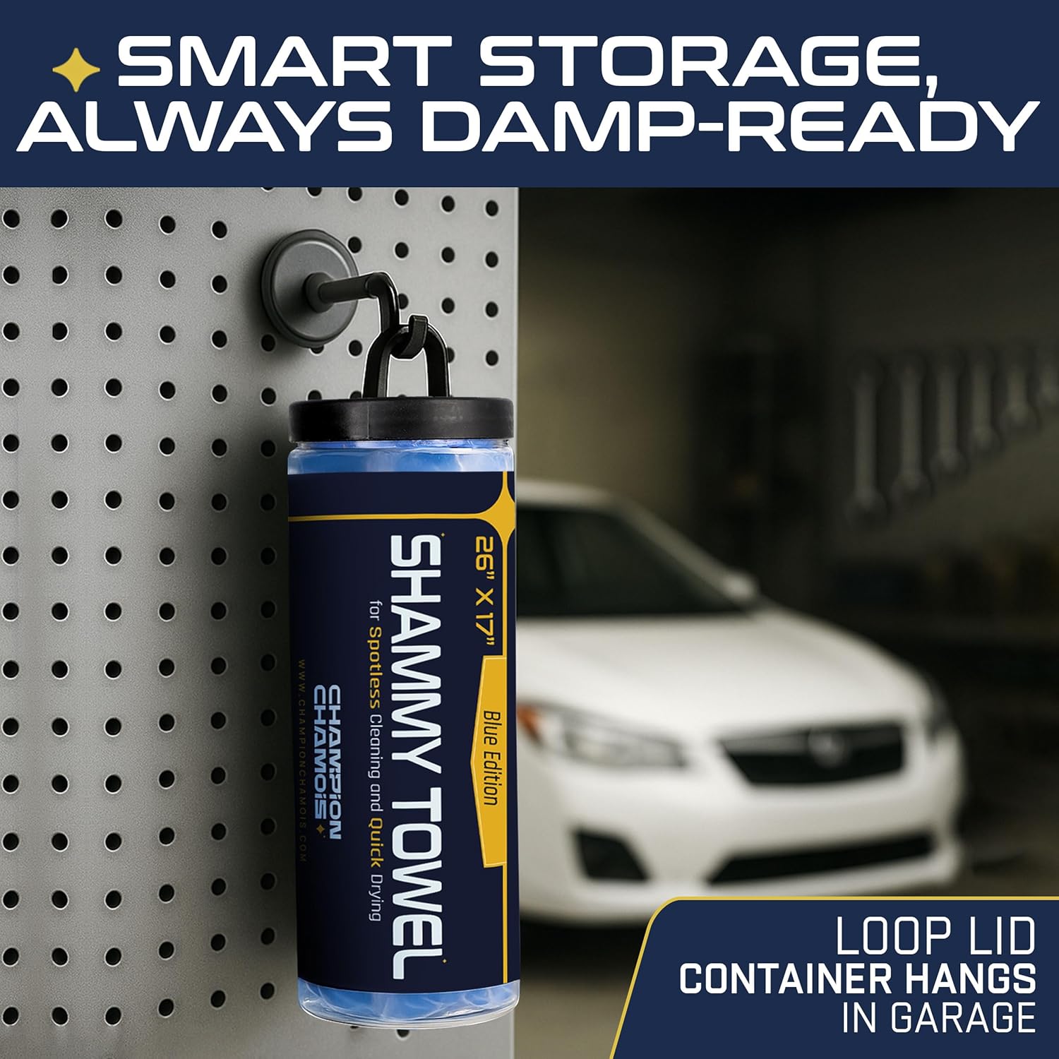 - REUSABLE - Our car wash shammy is built for years of use. It retains its absorbency wash after wash and is designed to withstand tough conditions. They're easy to maintain — just wash off dirt, wring out excess water, and store in the included container!