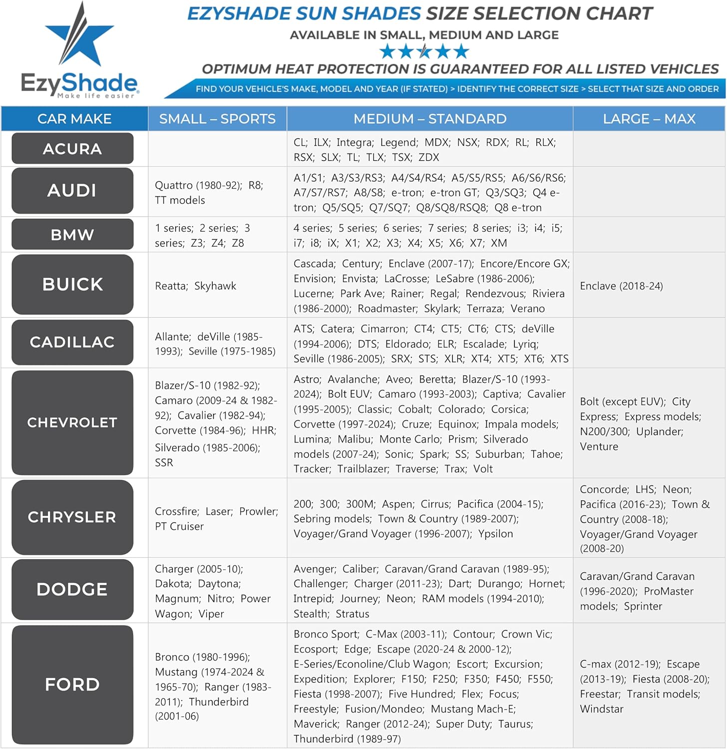 EzyShade Windshield Sun Shade with Shield-X Reflective Technology. See Vehicle Size-Chart. Foldable Car Sunshade for Front Windshield Window Car SUV Van Truck. Sun Visor Heat Shield. Sports (S) Size