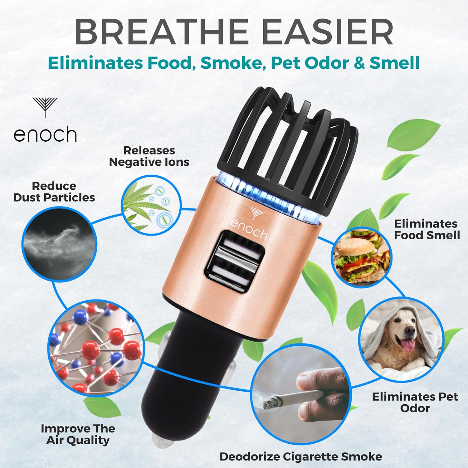 Enoch Car Air Purifier Premium Air Ionizer - 12V Plug-In Ionic Ozone Deodorizer Accessory with Dual USB Car Charger - Eliminates Cigarette Smoke, Pet and Food Odors, Dust (Rose Gold)
