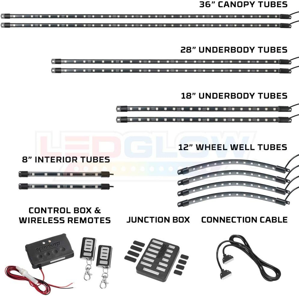 - Includes (2) 28" & (2) 18" Flexible, Water-Resistant Underbody Tubes that House 84 SMD LEDs, (2) 36" Canopy Tubes that House 66 SMD LEDS, (4) 12" Wheel Well Tubes that House 48 SMD LEDs, (2) 8" Interior Tubes that House 12 SMD LEDS, 12-Volt Powered Control Box, 2 Wireless Remotes, 12-Port Junction Box with 8 Port Plugs, Connection Cable, Self-Tapping Screws & Zip Ties