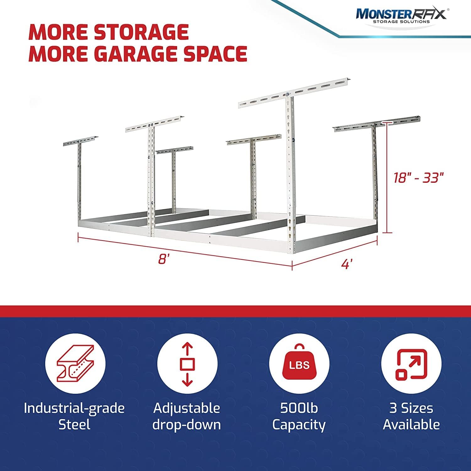 MonsterRax 4x8 Overhead Garage Storage Rack Frame Kit - Hanging Storage Shelves, Garage Ceiling Storage Rack System, Ceiling Shelving - (Hammertone, Adjustable 18"-33")
