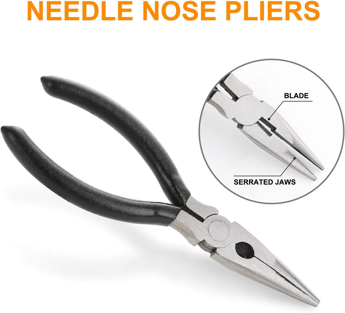 - REFINDED HANDLES - 2 T-shaped handles are made of heavy duty steel which gives greater comfort and maximum turning power during inserting and rotating. A 6 Inch needle nose plier features durable nickel chromium steel construction and it reduces hand fatigue. There is a sharp blade part for cutting something like wires.