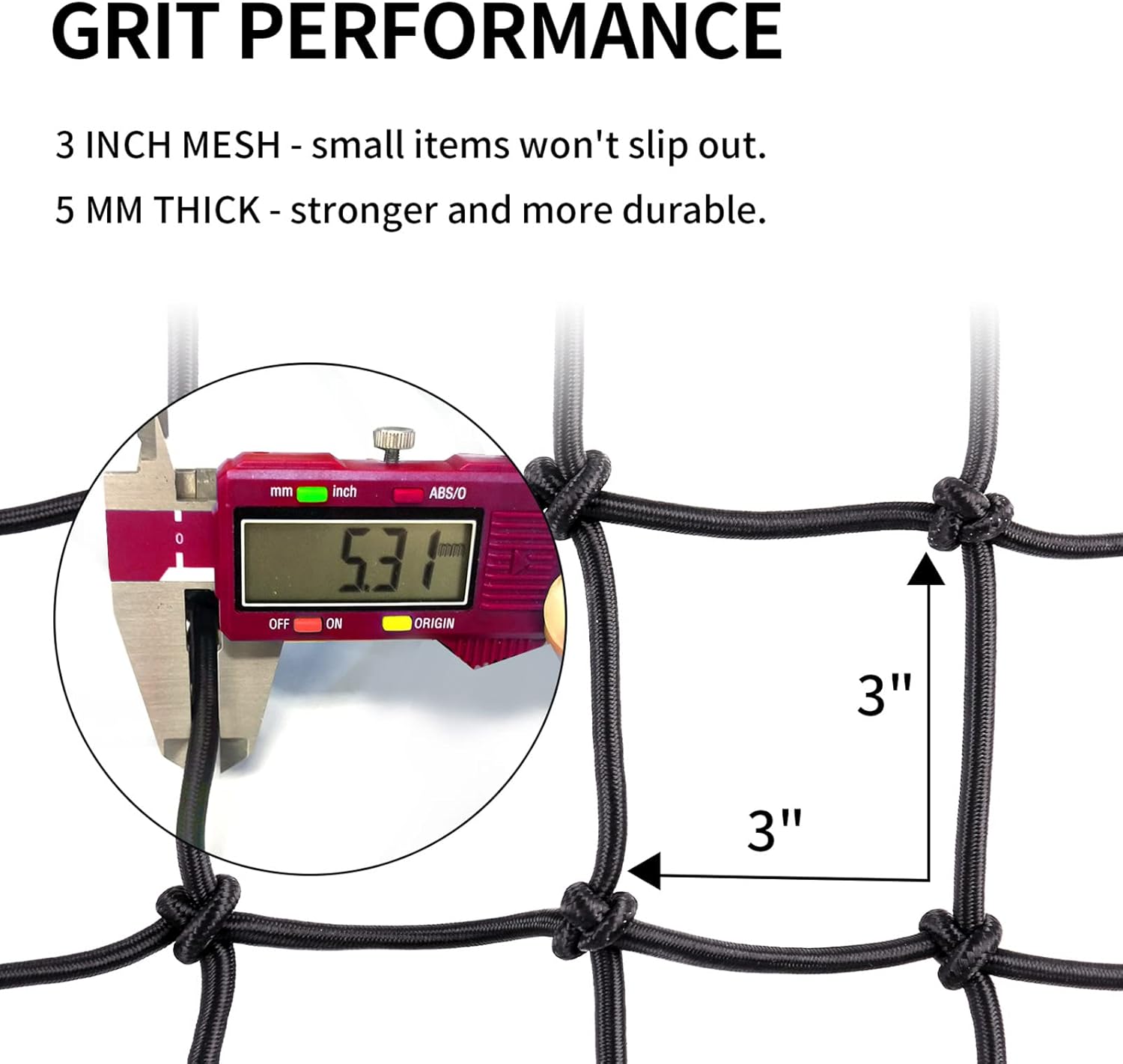 - [Cargo Net 3'x 4' ] : Designed with tight 3” x 3” mesh squares, the bungee netting keeps small items from falling out. 12 adjustable carabiners + 12 adjustable ABS plastic hooks quickly strap down light loads by simply moving hooks from 1 mesh square to another.