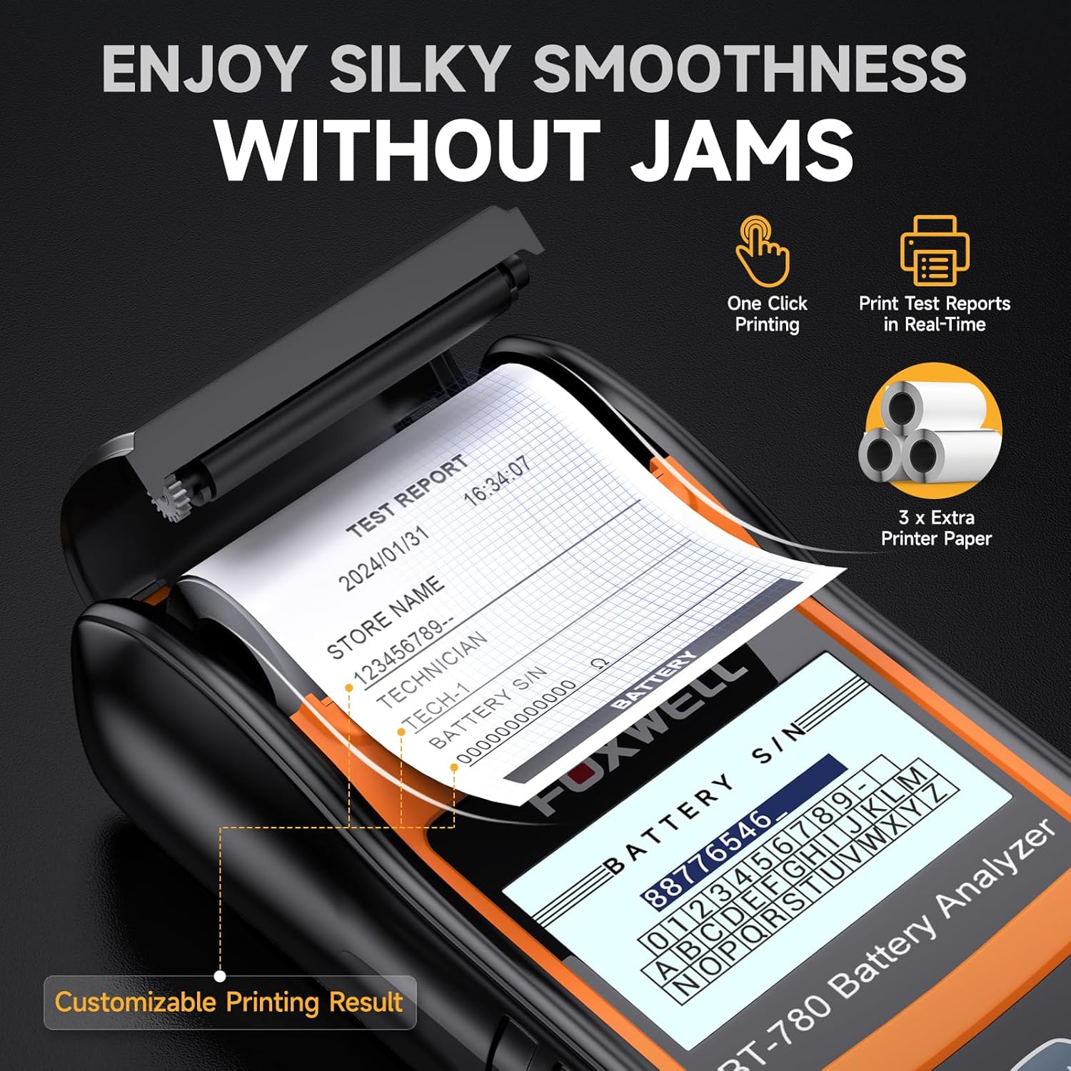 - PRINT REPORTS AT NO EXTRA FEE - Print clear, professional test reports in seconds with voltage, CCA, SOC/SOH, and cranking details, and save time and money with the battery tester with printer that includes 3 free rolls of 57×30mm paper and affordable replacements available online.