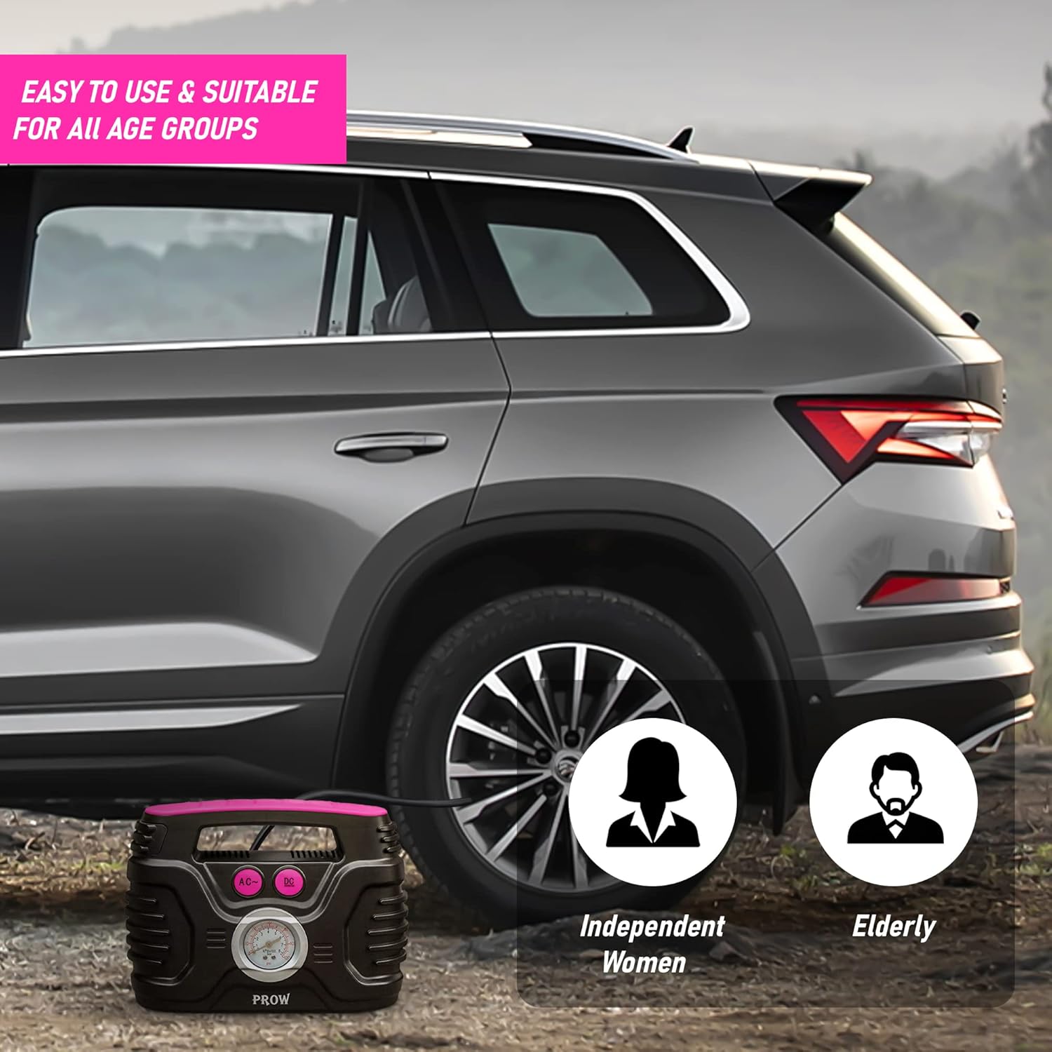- VERY EASY TO USE - Not very good at using digital products? Want to fill up and maintain the tires of your car all by yourself? Electric Air Pump Prow is a air compressor with an analog pressure gauge (rather than some complicated digital gauge) and is very easy to use and meets high quality standards. There are three simple steps to using the air compressor: 1. Connect the plug into the electric outlet. 2. Turn on the tire pump. 3. Once the tire reaches the appropriate pressure, you turn off the pump. Its ease-of-use makes it suitable for anyone, including women and seniors.