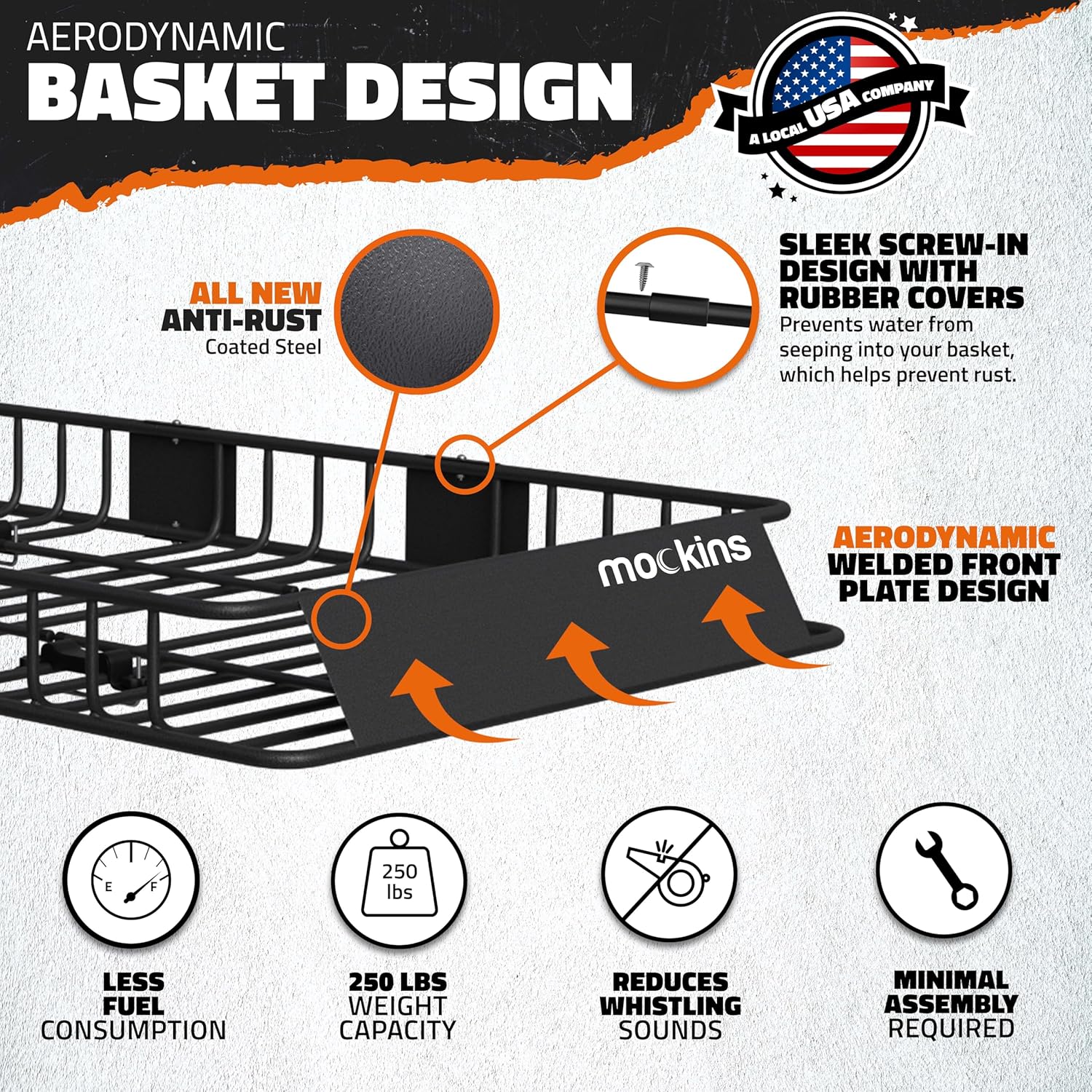 - CUSTOMER CARE COMES FIRST: At Mockins, we believe our clients deserve the highest quality roof rack carrier basket & roof bag bundle. Backed by a 10-year limited warranty, our cargo carrier roof racks for SUV , car, & truck are always built for long-term satisfaction. If you have any questions about our roof cargo carriers , our dedicated customer support team is ready to assist. The Mockins Roof Rack Basket Cargo Carrier & Roof Rack Cargo Bag provides secure rooftop storage, trip after trip.