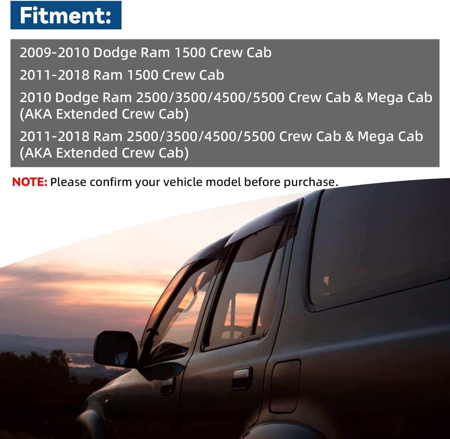 Set of 4 Window Visors Compatible with Ram 2009-2018 1500 2010-2018 2500/3500/4500/5500 Crew & Mega Cab with 4 Full Size DoorFront+Rear Smoke Sun/Rain Guard Outside Mount Tape-On Acrylic