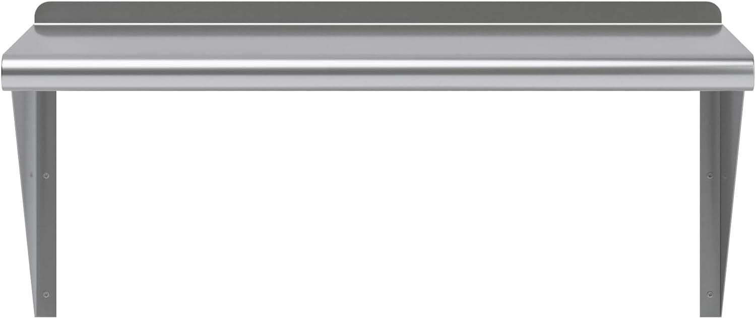 - This heavy-duty multifunctional stainless wall shelf is made with 18 gauge stainless steel and can hold up to 280 lbs of weight. The design features a 1" backsplash and bullnose edge. It's made with durable welded corners and support brackets.