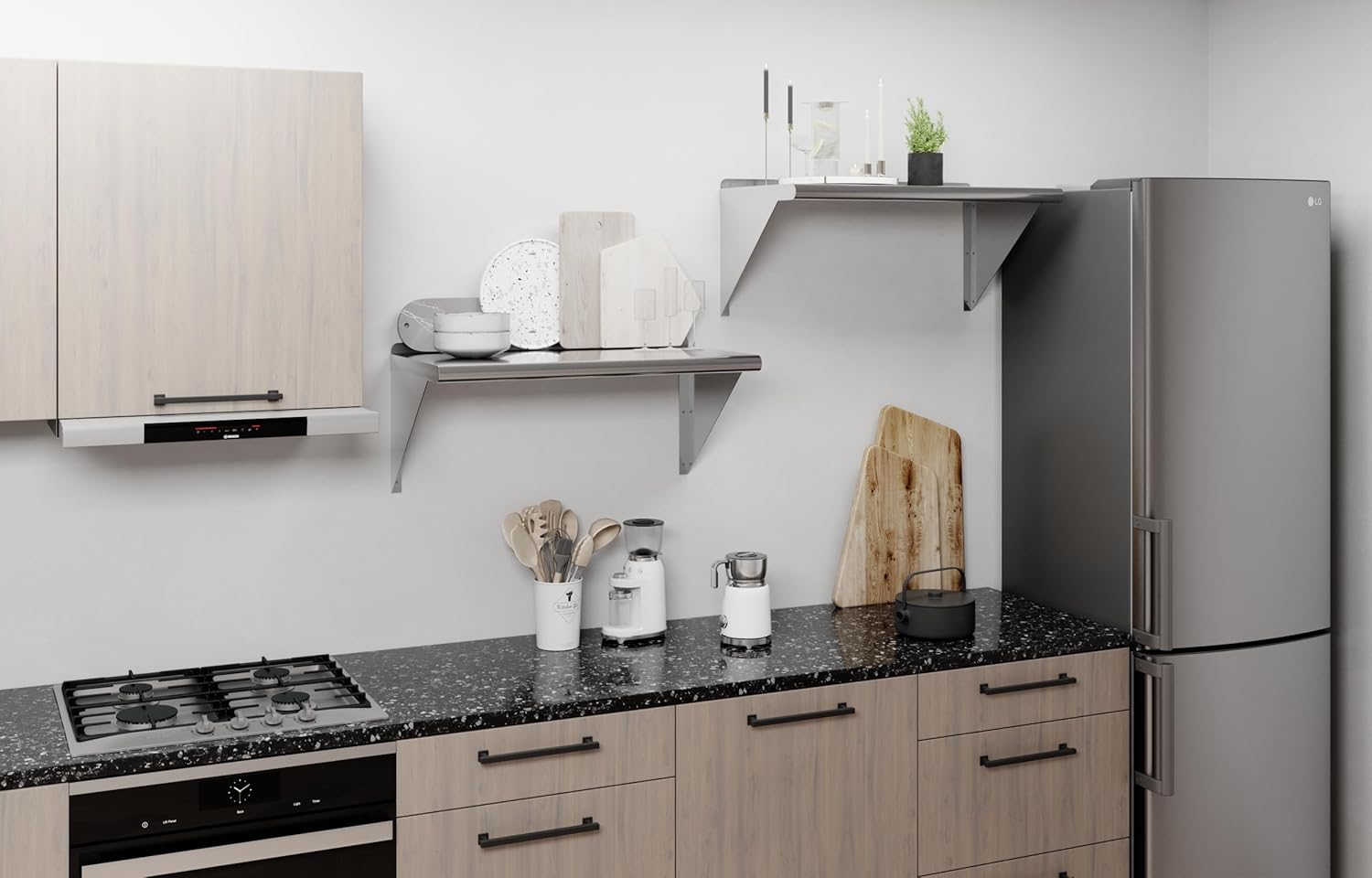 - Its professional, modern and sleek design makes this metal floating shelf perfect for use in any residential or commercial kitchen, food truck, garage, closet, laundry room, utility and equipment room, lab, appliance shelf for toaster and microwave, etc.