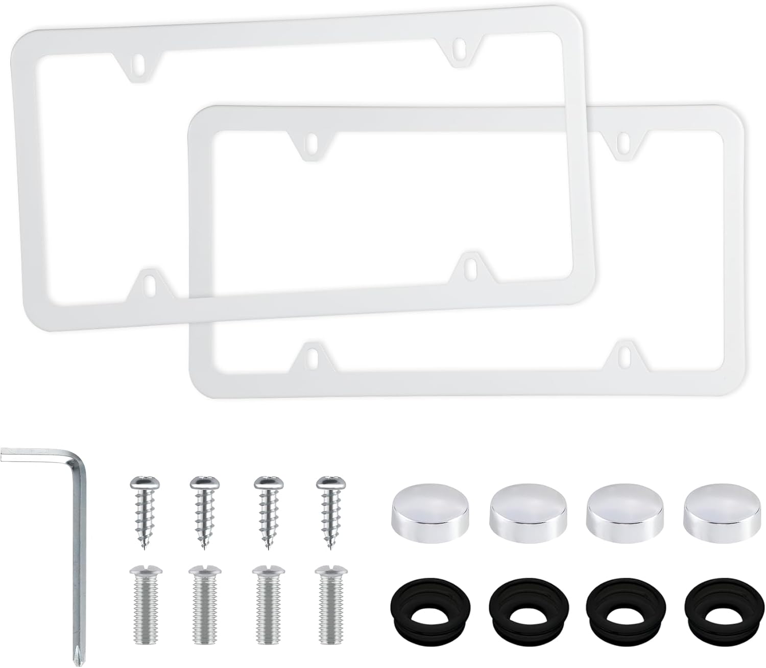 - Hardware included: 2 pcs License plate frames, with 12 Screw Caps (plastic), 12 Machine Screws, 12 Washers (plastic), 4 Self-tapping Screws, 1 Screwdriver. Frame size: 12.3 "x 6.3", internal dimensions: 11.4 "x5.3 ".