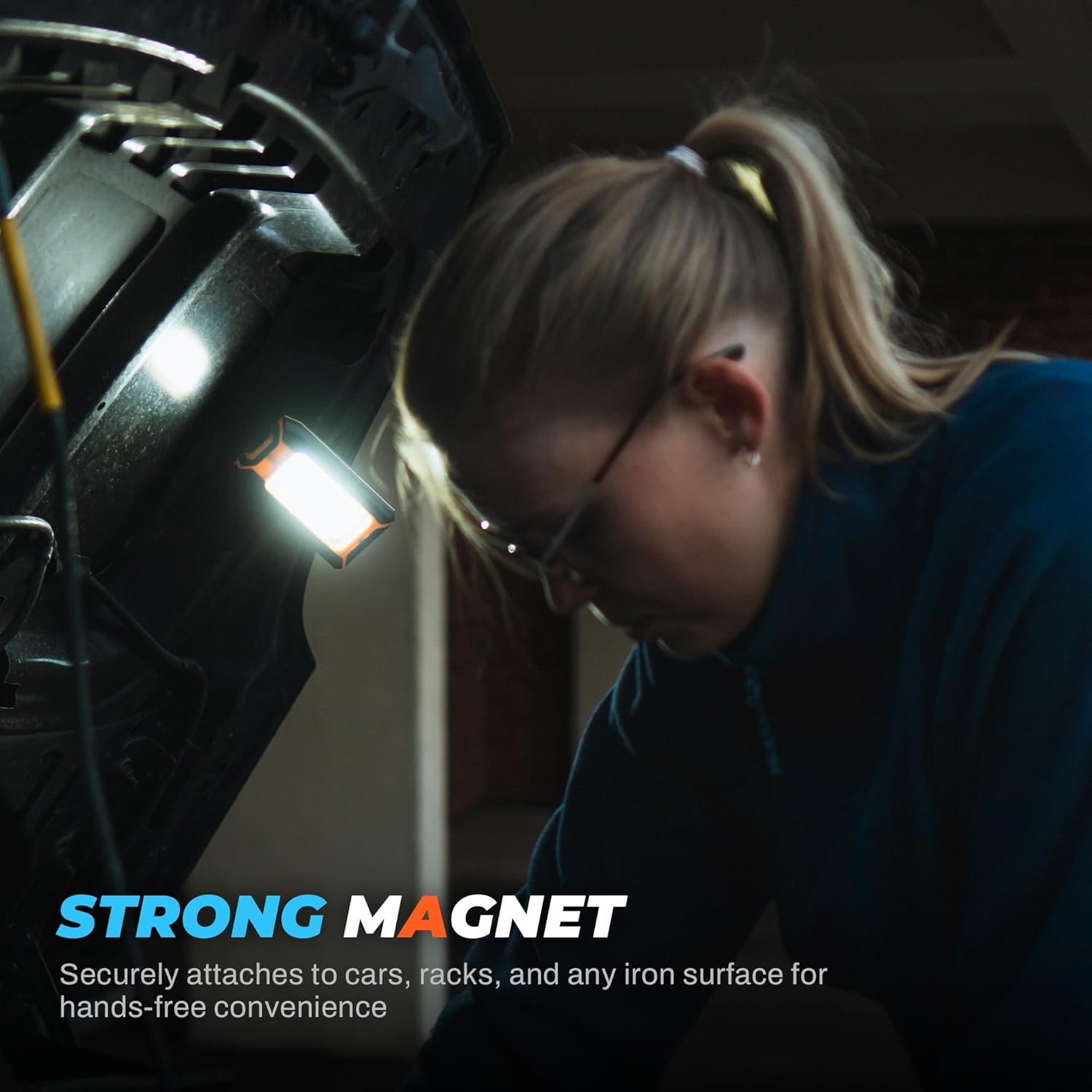 - 【Hands-Free Lighting Anywhere】Equipped with a powerful magnet, this magnetic LED work light firmly attaches to metal surfaces like your truck, tool chest, or main breaker panel, freeing your hands for repairs. The foldable hook lets you hang it inside a tent or enclosed trailer as an outdoor work light for market setups or other temporary booths