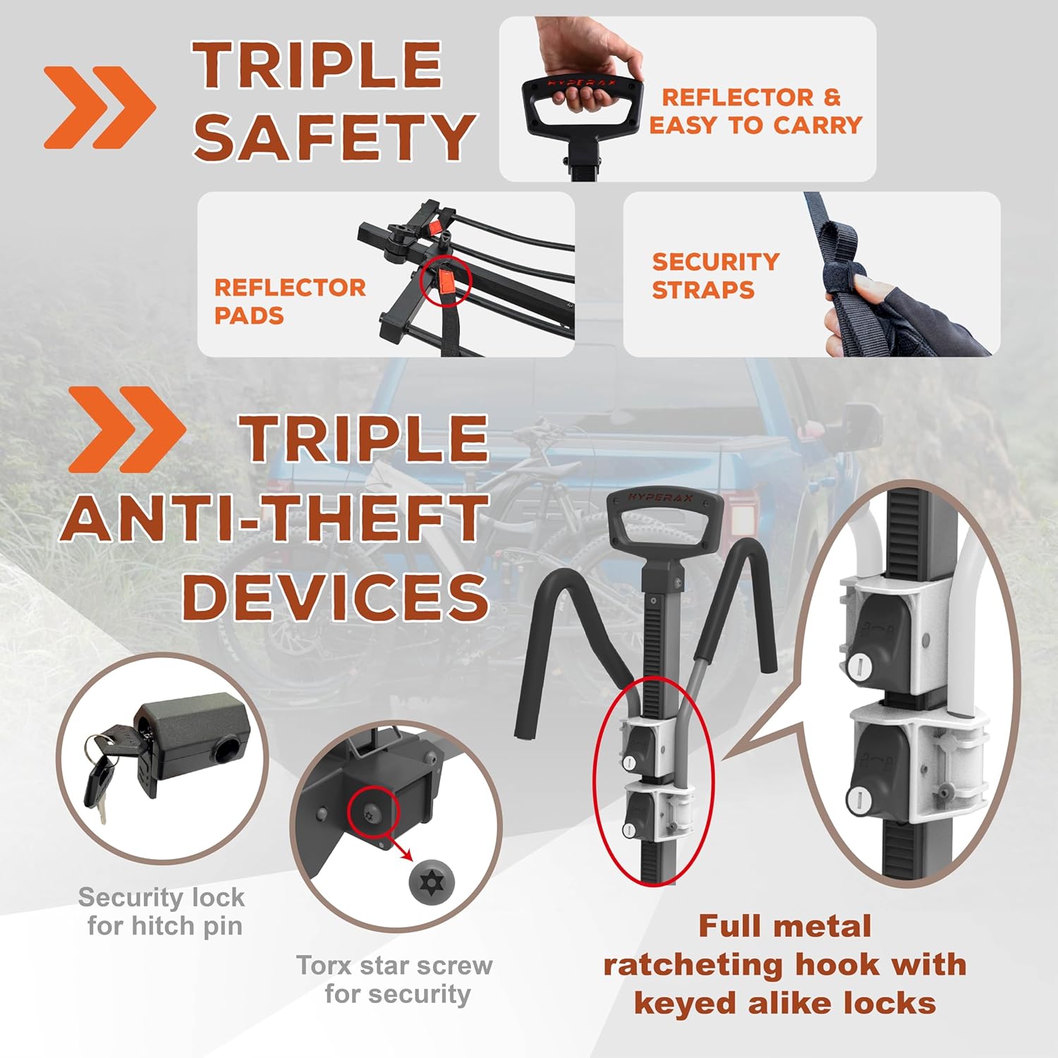 - SAFE AND SECURE: Comes with co-injected soft rubberized hooks that secure your bikes in place without scratching the paint. Featuring dual key locks to prevent bikes and bike rack from being stolen. Adjustable wheel holders allow you to easily accommodate bikes of different sizes and wheelbases. Tighten the wheels with reflective velcro straps that help improve visibility in the dark. Additional security straps included, ensuring your bike stays firmly on the rack