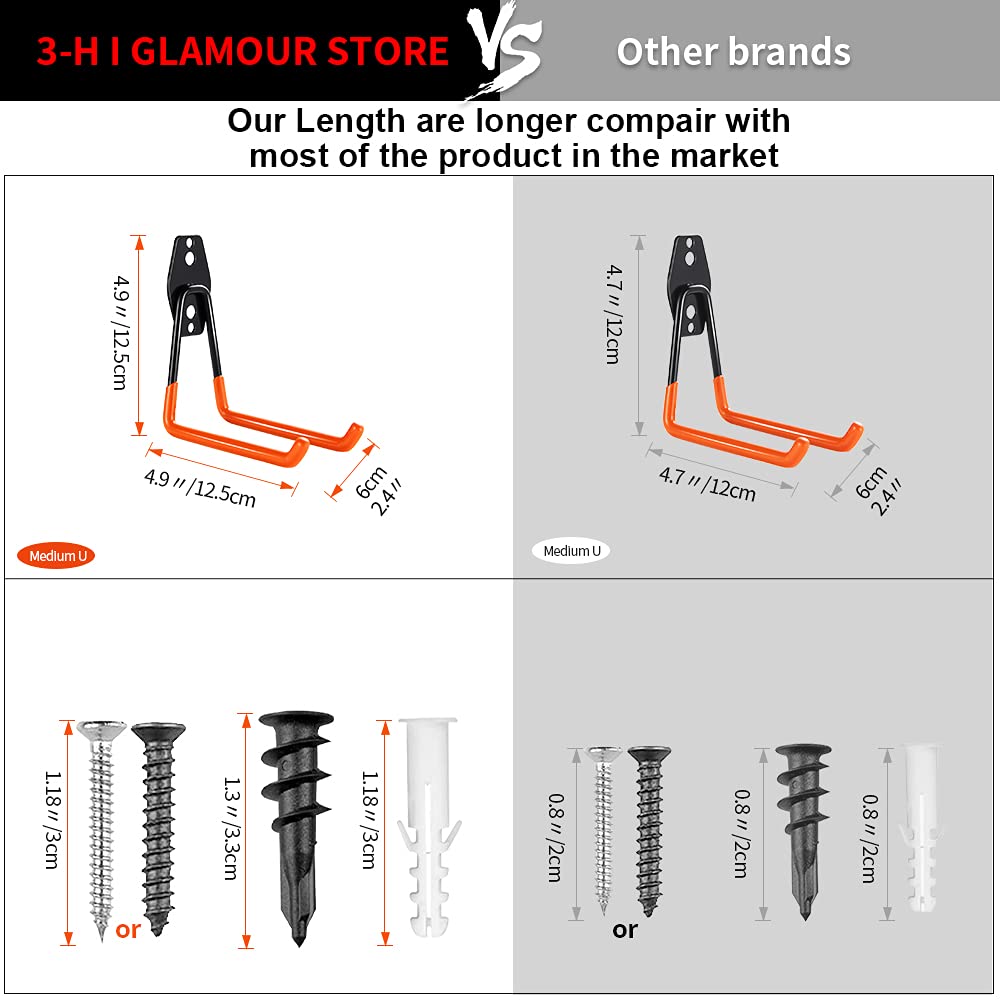 - ★-- EASY TO INSTALL & BEARING CAPACITY: These garage hooks are suitable for plaster, wood, brick, and concrete walls. You can install them effortlessly. For plaster walls, (1)Mark two big holes; (2)Twist the black wide thread screw plug in. For wooden/brick walls, (1)Mark two small holes; (2) Drill a hole and hammer in the plastic anchor; (3) Twist the steel screw nail into the anchor. The bearing capacity depends on different types of walls; different sizes of tool hooks and screws.