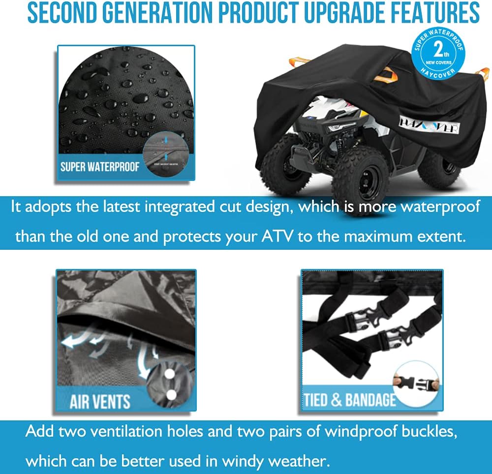 - SUPER WATERPROOF--Our special textile process(Two-thread stitching), HAYCOVER ATV cover can withstand up to 2000 Pa water pressure (Most competitors only 700-800 Pa). In addition, your ATV will perfectly keep dry even during a rain.