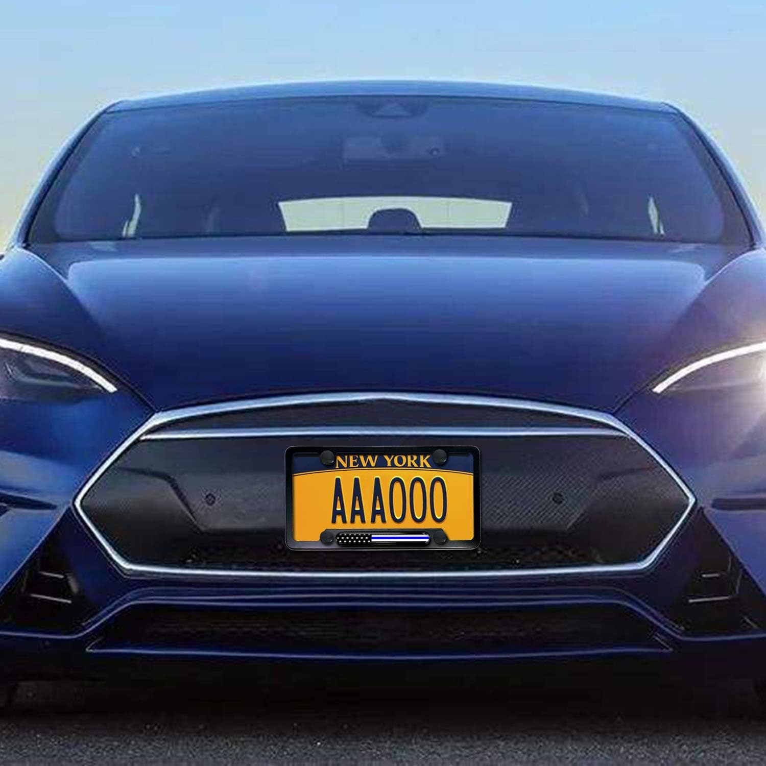 - Patriotic License Plate Frame- Thin Blue Line License Plate Frame shows your support for law enforcement. This is a personalized present for active military, police officers, firefighters, and emergency medical service providers. The 4 holes Matte Black Aluminum license plate bracket can protect and decorate the front or rear car/truck/SUV tag plate! Blue and White Star Strip Flags are considered a patriotic expression, this American Flag License Plate Cover is perfect for this mission