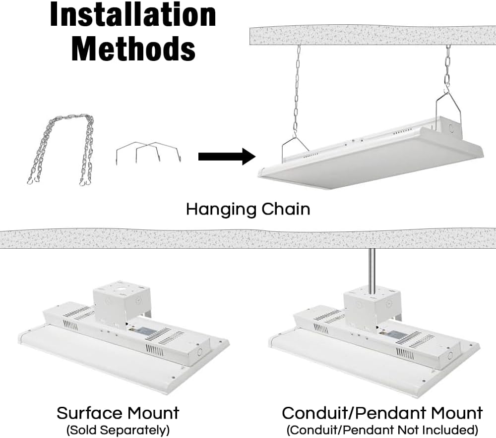 - 💡 Easy Installation - No Bulbs and No Maintenance Ever! Plug and play installation can be done in minutes and accepts multiple voltages from 120-277V AC. It has half inch knockout holes for installation of accessory sensors or NPT. Surface and Pendant Mount Kit available by searching ASIN B08FZQ9961.