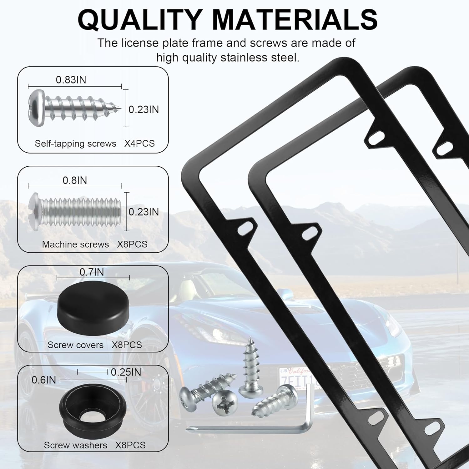 - Hardware included: 2 pcs License plate frames, with 12 Screw Caps (plastic), 12 Machine Screws, 12 Washers (plastic), 4 Self-tapping Screws, 1 Screwdriver. Frame size: 12.3 "x 6.3", internal dimensions: 11.4 "x5.3 ".