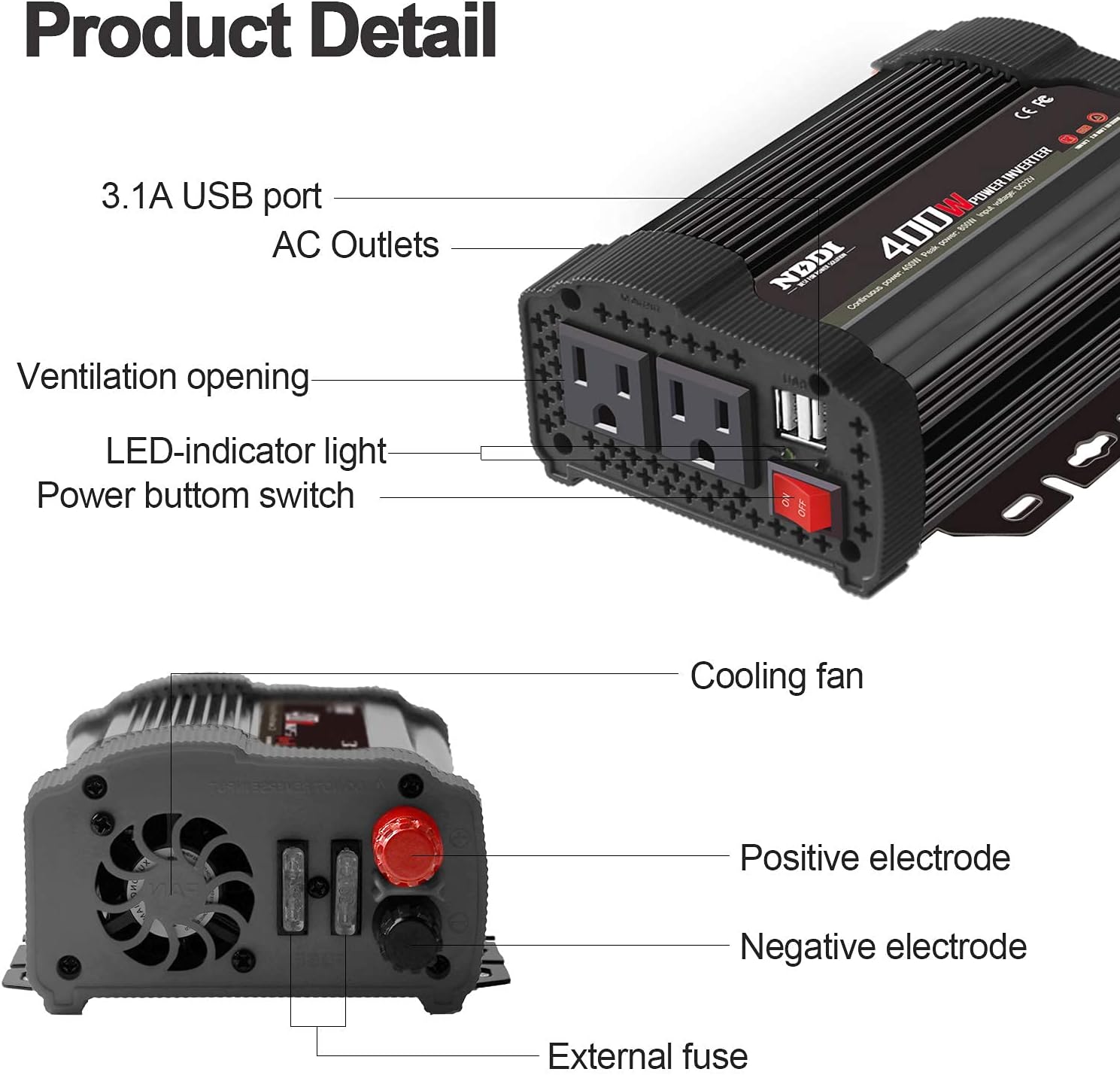 - 【DC to AC Inverter】: NDDI premium 400W car power inverter with 2 AC outlets,dual quick charging 3.1A USB ports and 1 DC cigarette lighter socket, 21.65inch cord enough for you to use anywhere in the car. Provide top speed and stable continuous power for devices.It will solve the power problem for your long journey, camping, car entertainment and emergencies.