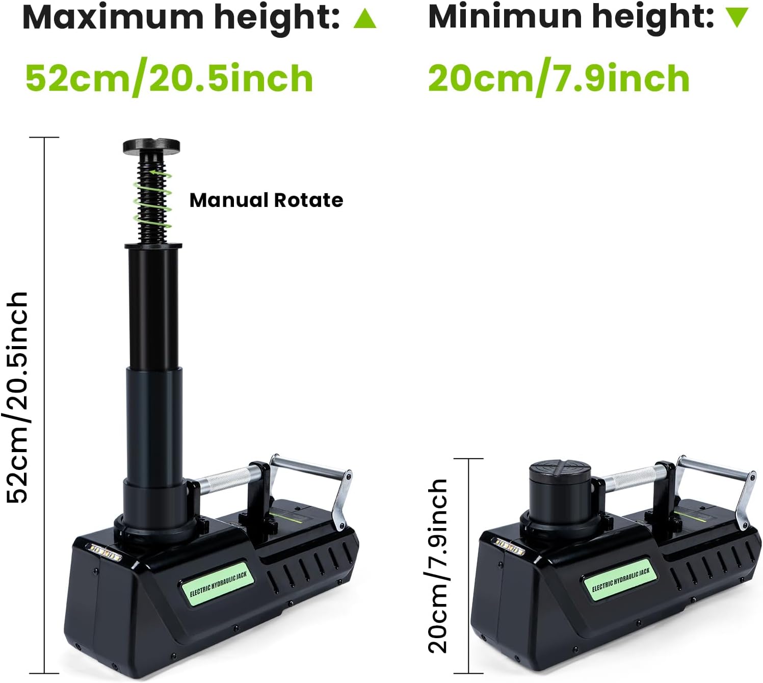 - 【Powerful Electric Jack】This 12V DC car jack has a loading weight of 15 tons and a lifting range of 200mm-520mm/7.9-20.5in, making it a good helper for vehicle maintenance.