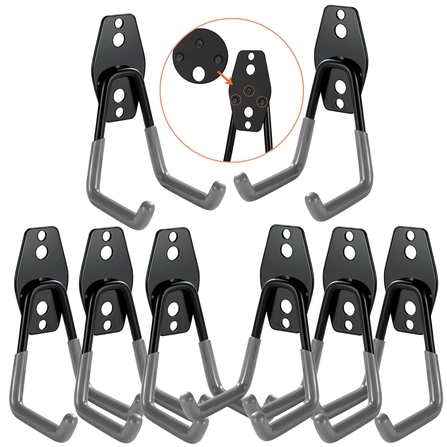 - One SIZE U Shape Garage Hooks:8 pcs wall hooks for hanging heavy duty Perfect for your Garage. The stoarge hooks is wall mounted double hooks.The extended length and anti-slip coating let you organise.nice variety for your garage.The length of the steel screw nail, the black wide thread screw plug and the white plastic anchor is individually 1.18", 1.3" and 1.18".