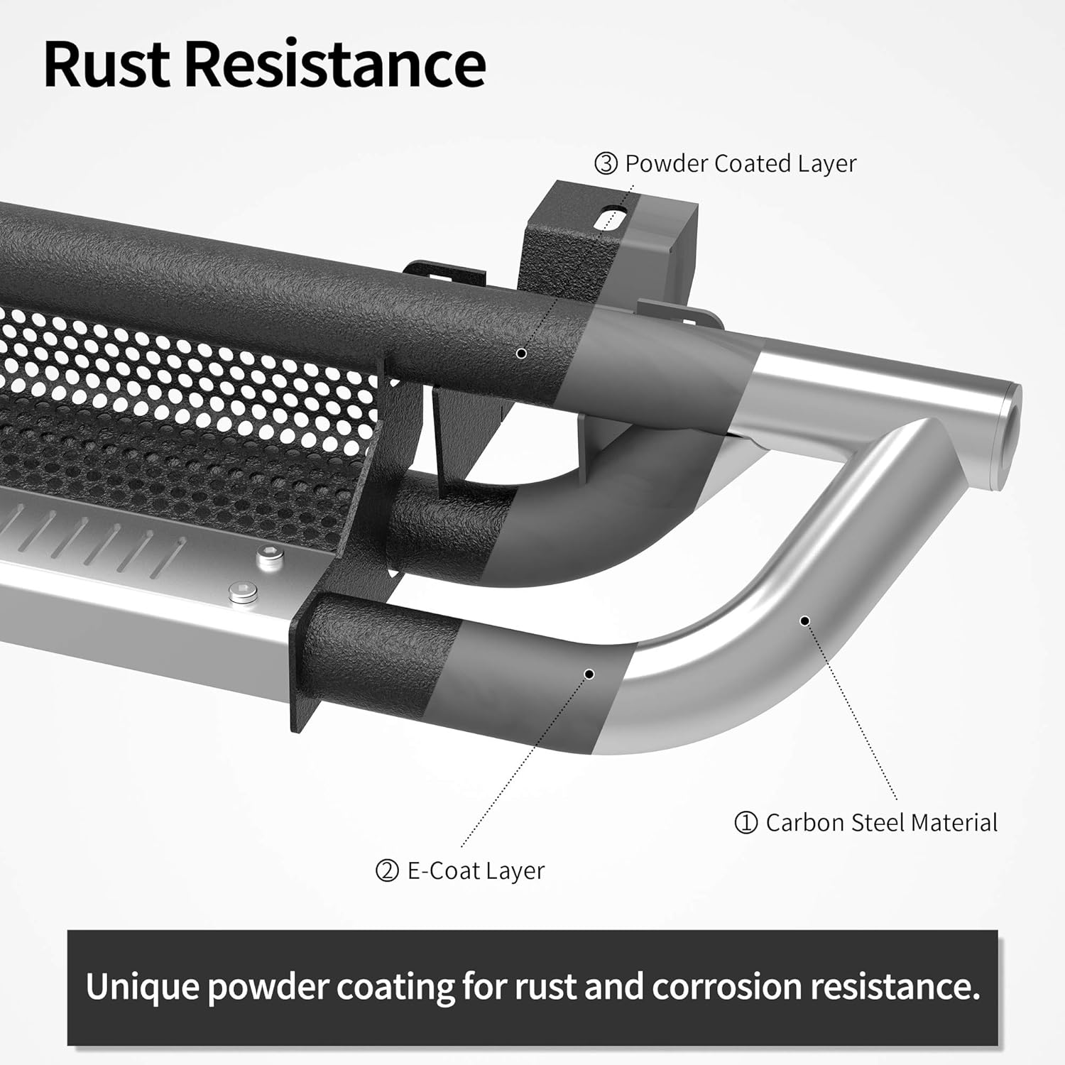 - Strong and Durable - Unique powder coating offers exceptional rust and corrosion resistance so you can drive under any condition. The laser cutting step plate achieves a non-slipping step surface and reinforced grip. Proven to handle up to 450 lbs. without bending.
