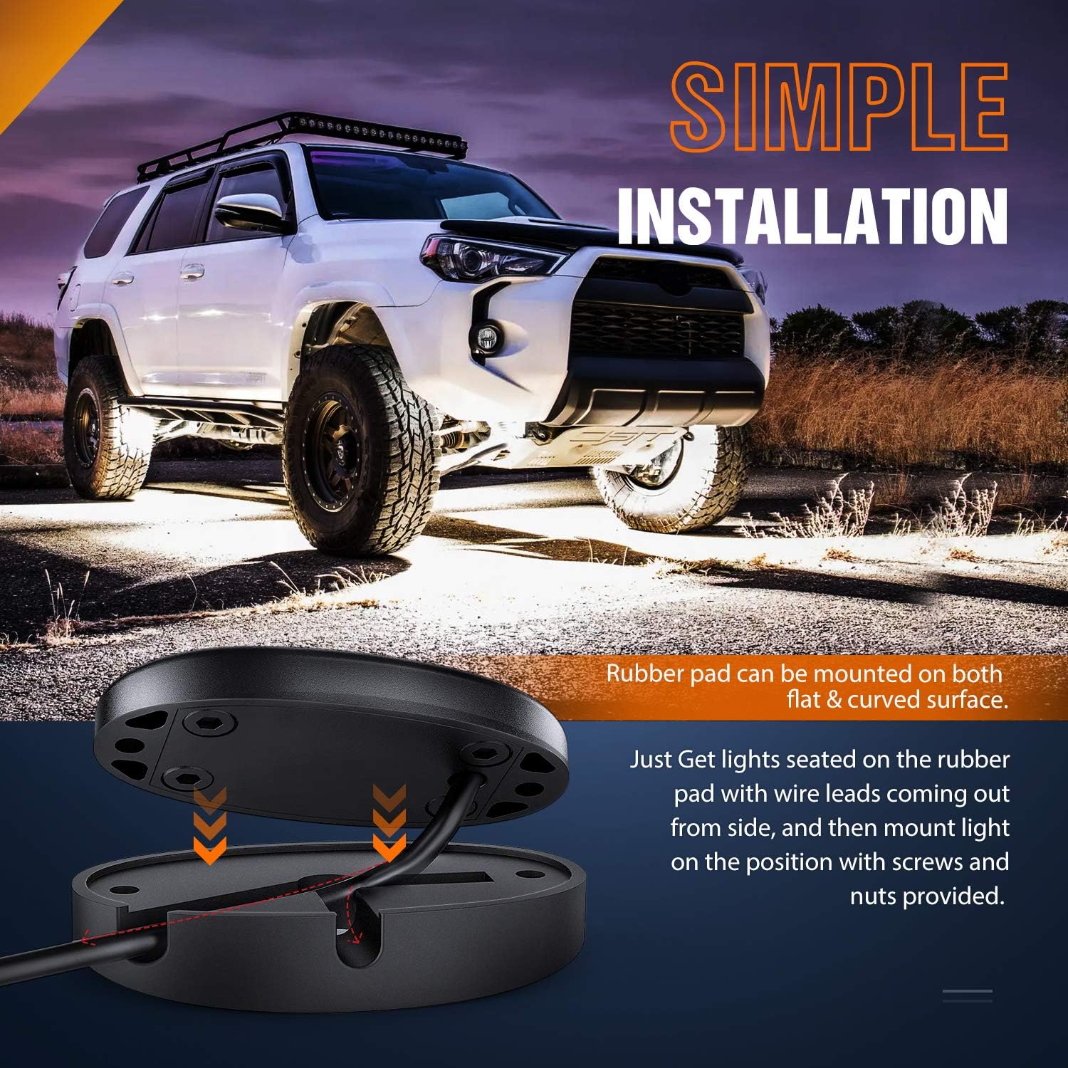 - Easy Installation: Get lights seated on rubber pads, with wires coming out from the side, and then mount light on the position with screws and nuts provided. Rubber pad works on both flat and curved surface