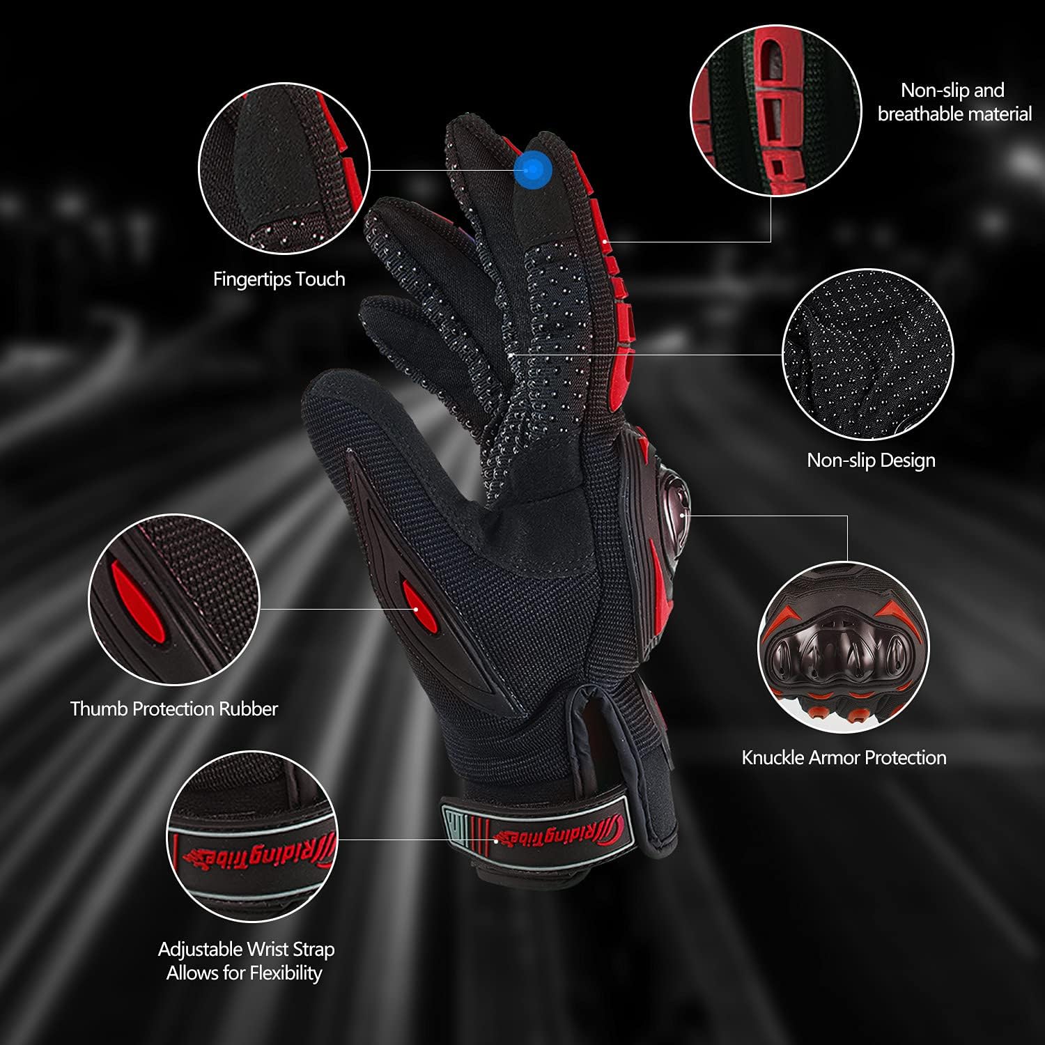 - -Protection: The motorcycle gloves keep fingers and knuckles from getting injured and bruised. There is also extra padding protectors for the thumbs and palms. Hands are protected from abrasions and fractures, especially in the event of an accident.