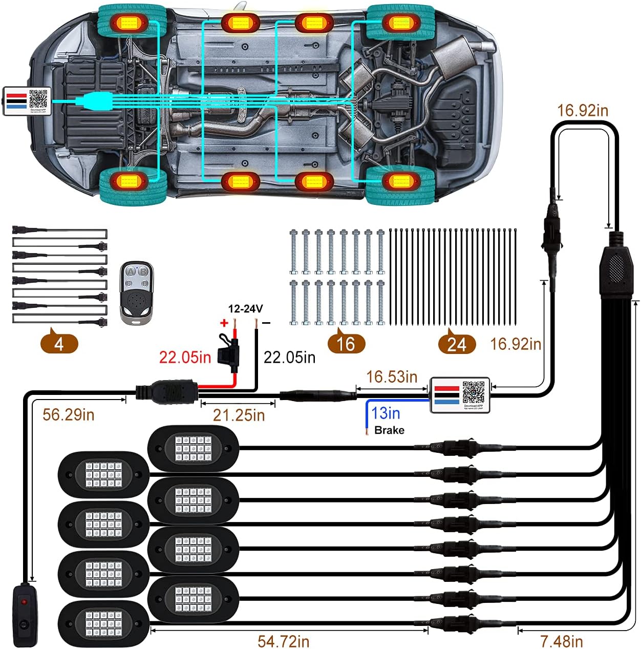 - [ Easy Installation & Widely Application ] ➤ Sacn QR code on driver box or user manul to download APP, the app is compatible with iOS 7/Android 4.3 or above, switch on phone bluetooth quick connect APP to setup lighting effect. Rock Lights can be widely used not only Off Road, 4X4, Motorcycle, ATV/SUV/UTV, Boat etc., but also in indoor, chassis lights, deck lights, ambient light, neon lights, etc. If you need an extension cable, please purchase the asin: B08VN4G4H3.
