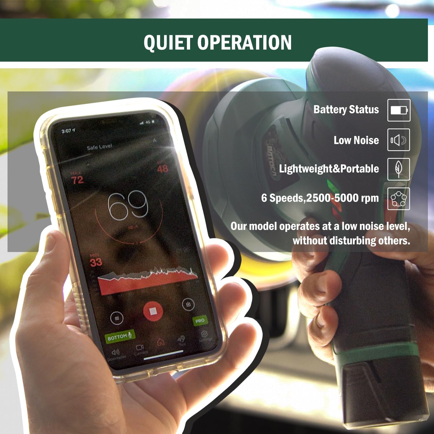 - DURABLE & NOISELESS: The shell of batoca battery buffer hand held buffer is made of Hi impact ABS. The inside has a powerful motor, which is made of all cooper with anti-interference. Small buffer polisher for car detailing cordless is a perfect substitute for the power polishers & buffers or automotive buffer.