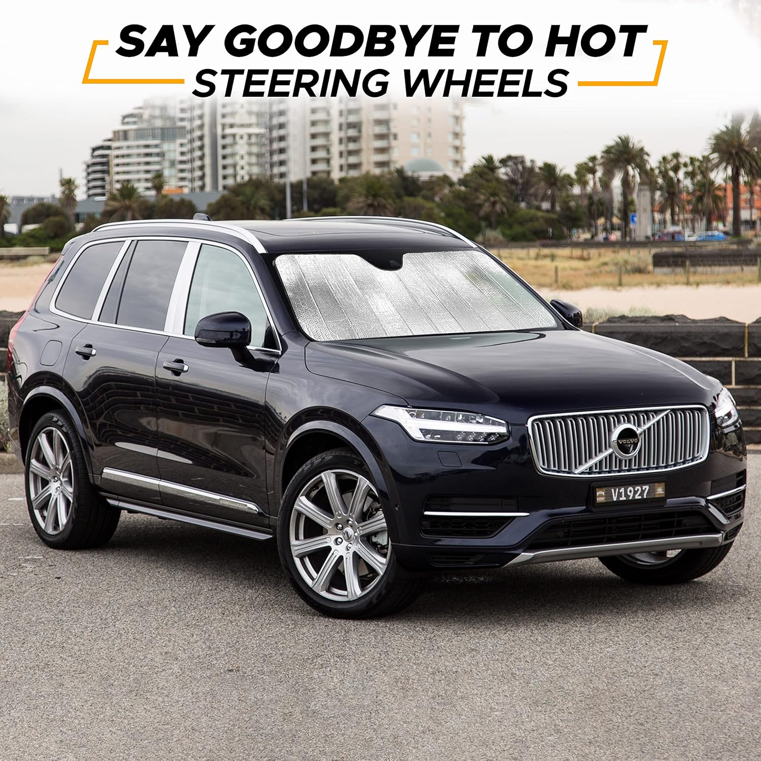 - Perfect Fit for Maximum Coverage: Measuring 58" x 28", this car windshield shade accordion style is perfect for most cars, trucks, and SUVs. It offers complete front window sun shade coverage, helping protect seats and electronics from overheating and UV damage.