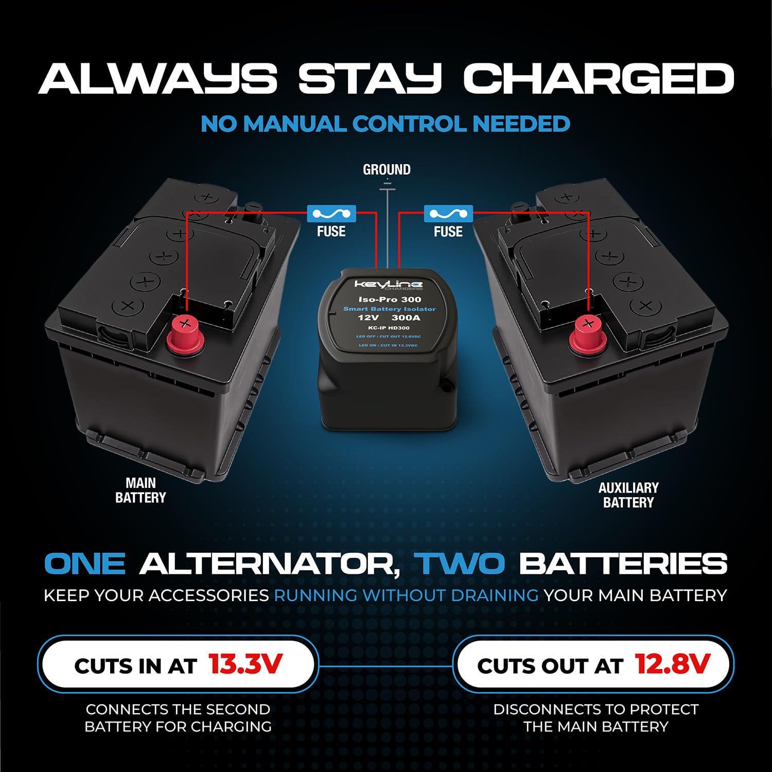 - Do you have more than 150 amp hour capacity of auxiliary battery? Do you need even MORE power and amperage for your additional accessories or inverters? When our standard 140 amp isolator isn’t enough, you need the Heavy Duty Keyline 300 amp isolator. Key line Chargers has the ONLY 300-amp Dual Battery Isolator on the market! Providing you with everything you need, our 300-amp Dual Battery Isolator kit is the BEST charging solution for heavy duty dual battery systems.