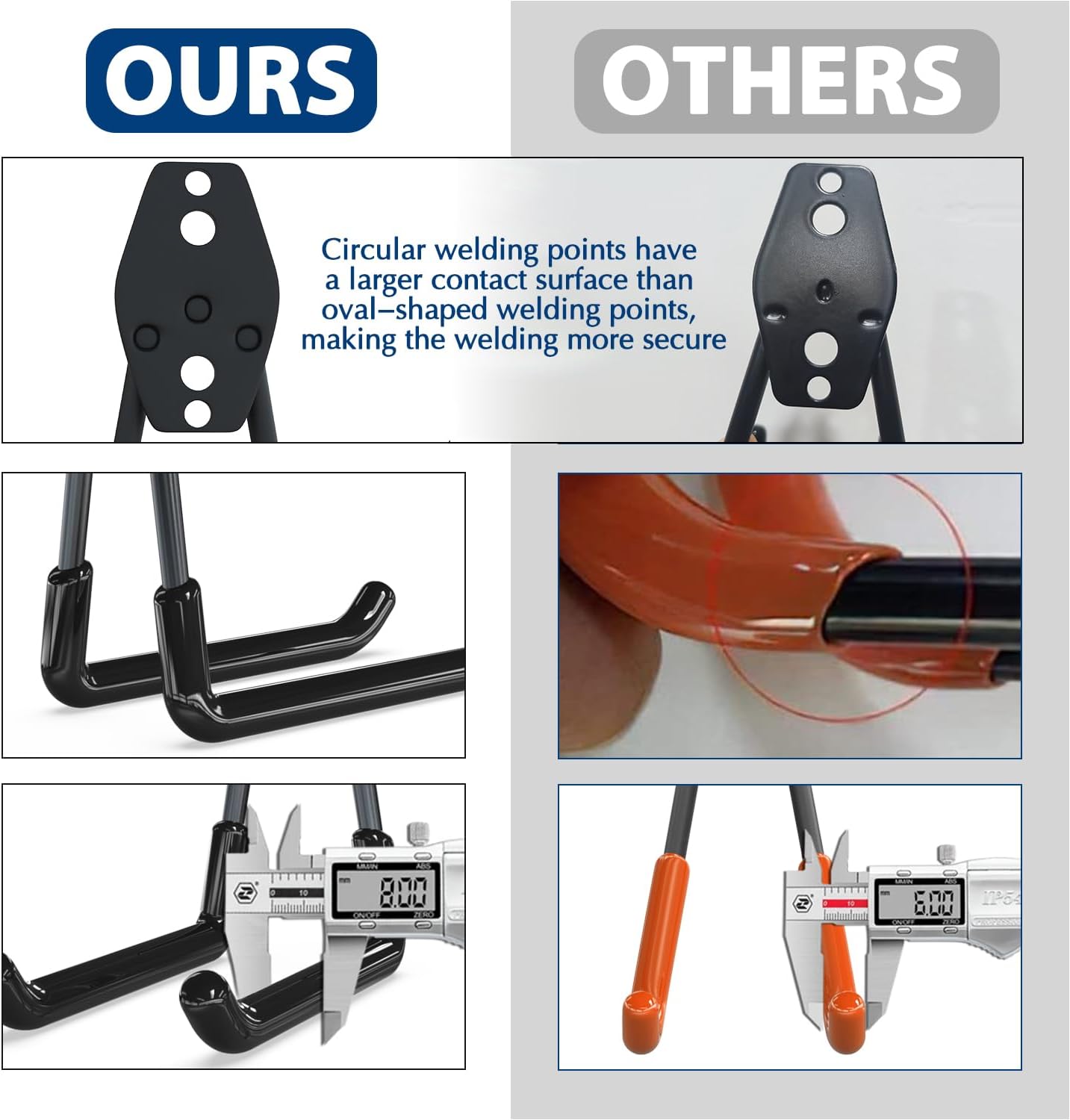 - Upgrade Design for Garage Wall Hooks: Different from other similar garden tool organizer with oval-shaped welding points, our designed circular welding points. These provide a larger contact surface between the hook and the backboard, offering higher security. We provide the most secure garage organizer in the market that means our bike hanger can bear more weight up to 42KG/92LB