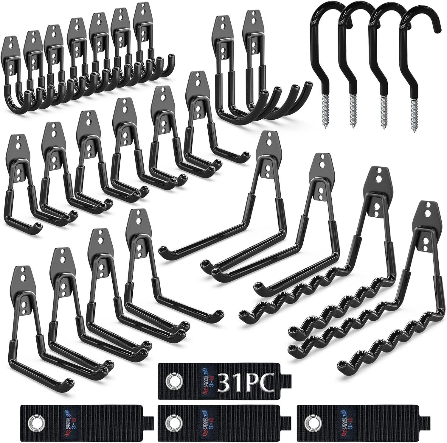 3-H Garage Wall Hooks 31 Pack, Garage Hooks Heavy Duty with Extra Welding Spots, Garage Organizer for Garden, Lawn, Yard Tools, Chairs, Ladders, Weed Eater, Shovel, Blower(Black)