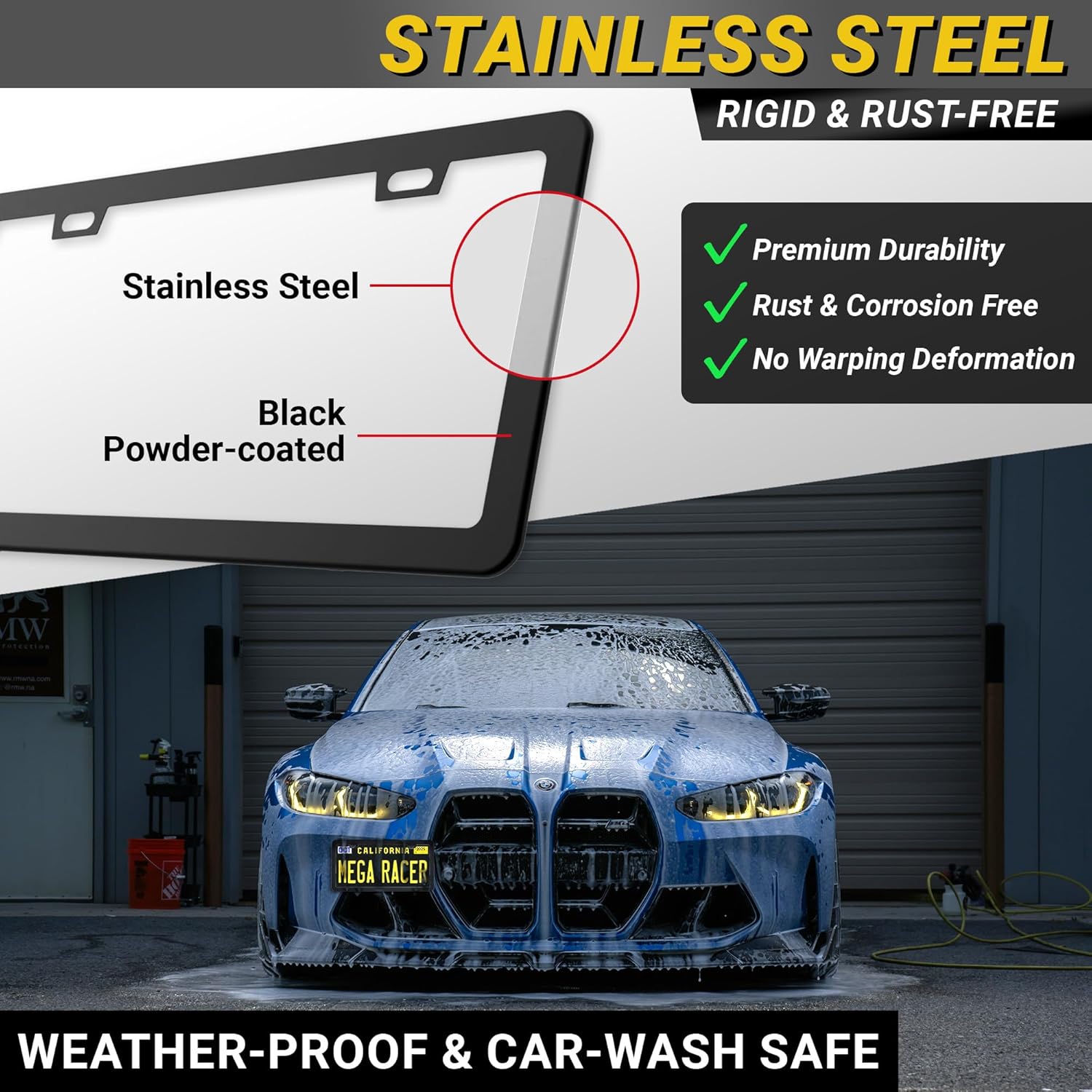 - CAR WASH SAFE & WEATHERPROOF: You want your car accessories to be safe and stay looking great. This is why we made sure our car plate frame is both car wash safe and weatherproof.