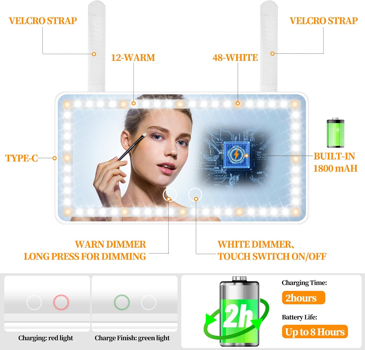 - DIMMABLE BICOLOR LED LIGHTS: The car makeup mirror has 12 yellow lights and 48 white lights, which is 40% brighter and 60% less energy than normal bulbs. Short press the 2 sensor switches to replace 3 light colors: white, yellow, white and yellow. Long press for dimming according to what you need. 2500-6500K color temperature is equivalent to outdoor sunlight, the makeup is naturally no difference