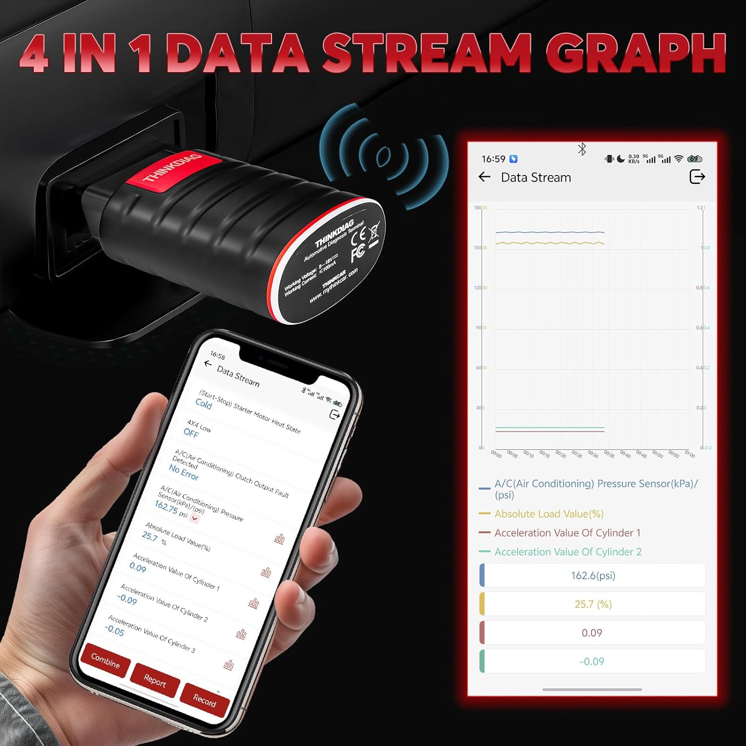 - 【📲 Intelligent Diagnostic Tool with Auto-VIN】Thinkdiag Bluetooth OBD2 scanner makes your smart phone device become a professional vehicle diagnostic tool, it compatible with Android and iOS system. Auto-VIN function supports the Thinkdiag identifies the most car models automatically, if autovin failed, you can choose car info manually. Full system Vehicle health report will be automatically created after diagnosis, report can be shared. Live Data Stream combined 4-in-1 Graphing+Data Record better for monitoring vehicle performance and analyze the abnormal parameter.