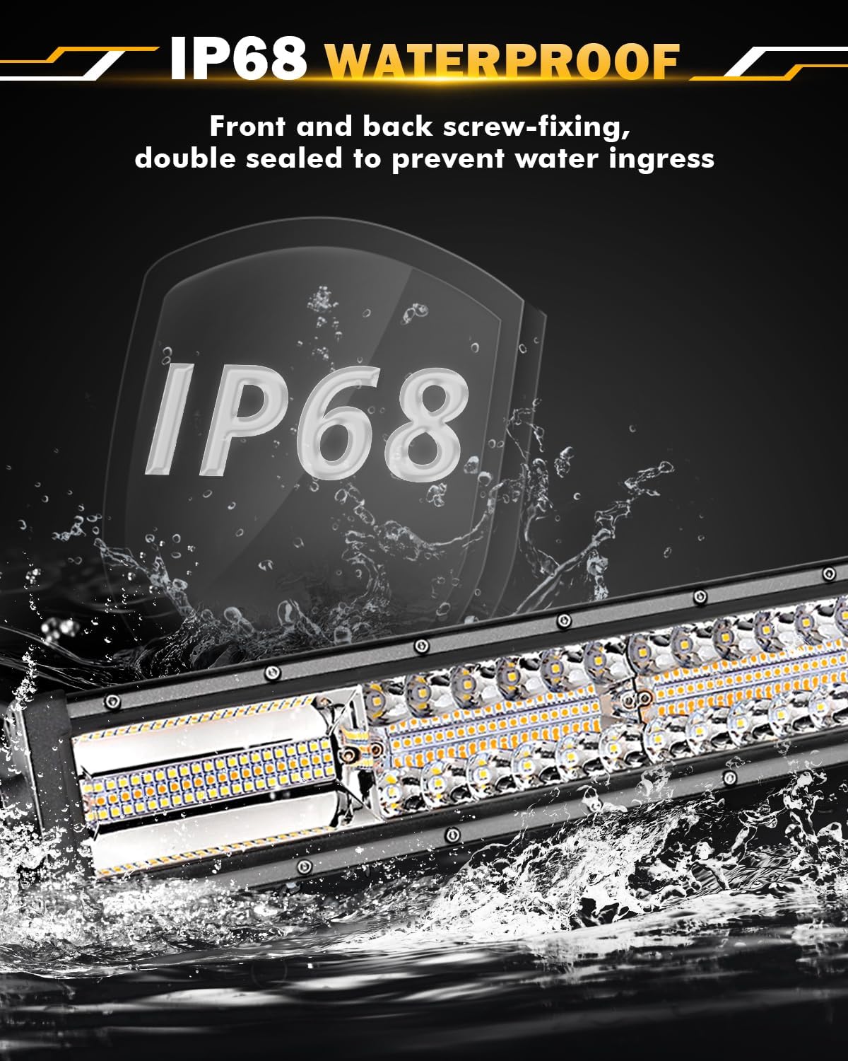 - 【IP68 WATERPROOF RATE】6 modes light bar built in IP68 waterproof adopts upgraded waterproof die-casting aluminum housing and advanced sealing technology to withstand any harsh environments and weather conditions. Also, our lights are with built-in no electromagnetic interference (EMC), resolve the issue of radio interference and flickering